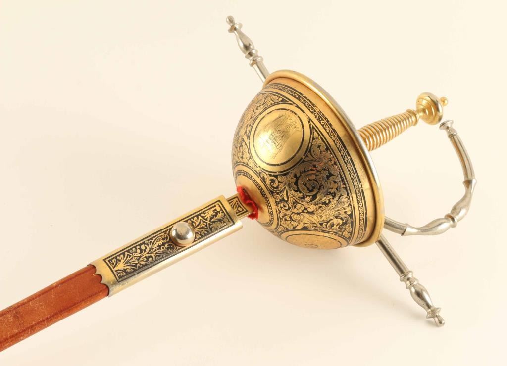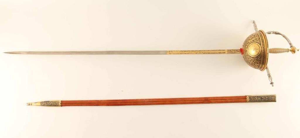 Gold Washed Decorative Court Sword Has A 34" Blade And A Cup Style Hand Guard Also A Brown Leather Scabbard With Gold Washed Furniture