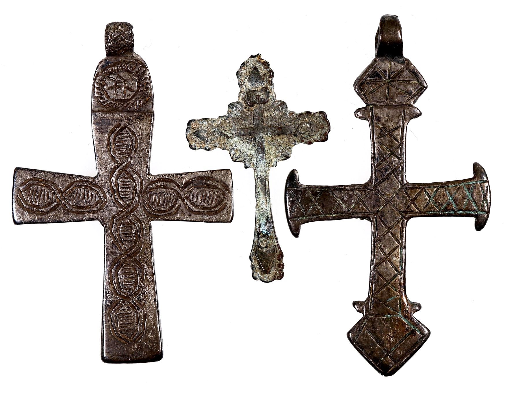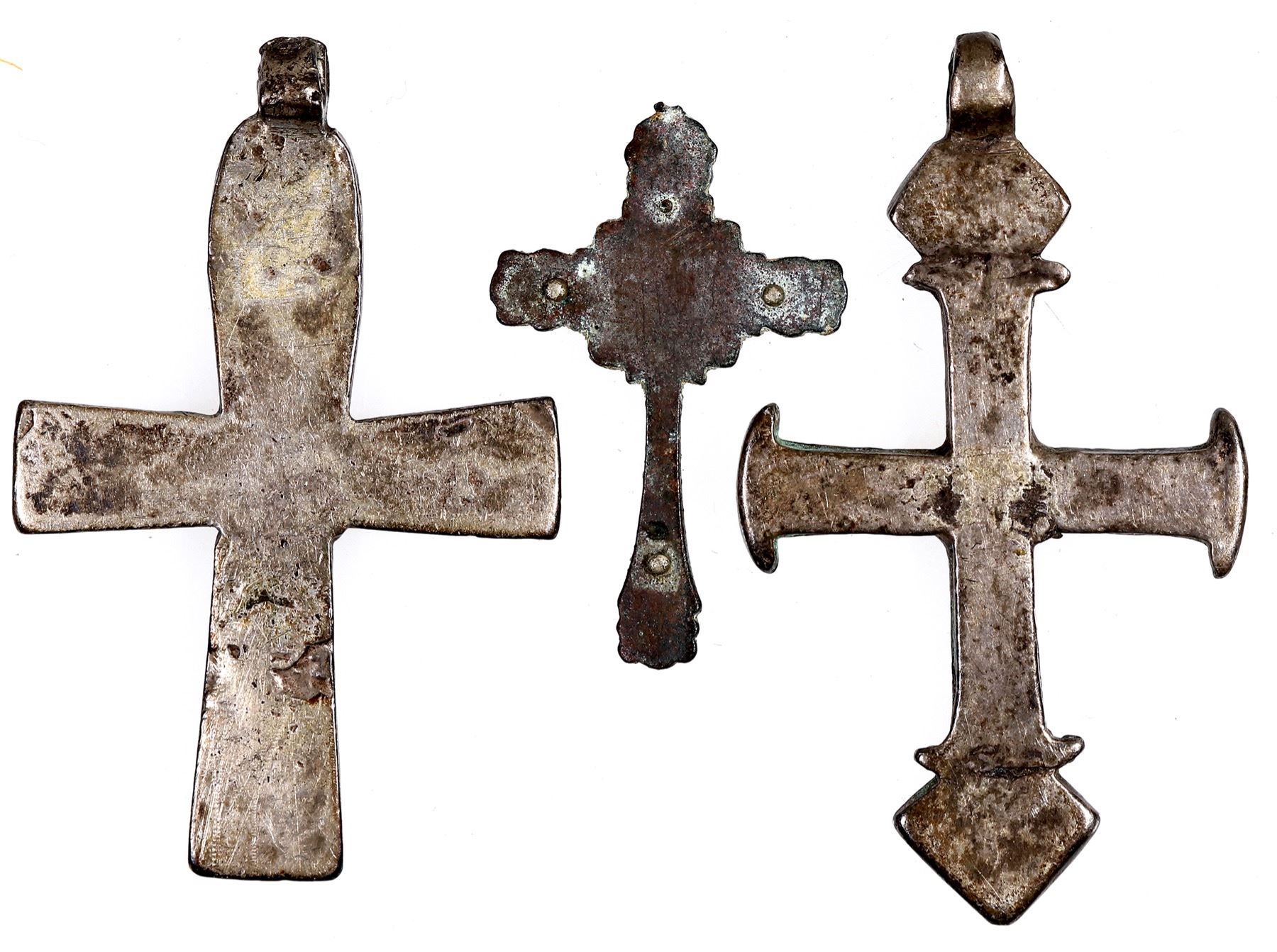 3 metal Spanish Crosses. c. 1600 metal detected in St. Augustine, FL. 1 5/8x1 1/8". 2 others silver plated, about 2.75x1.5".