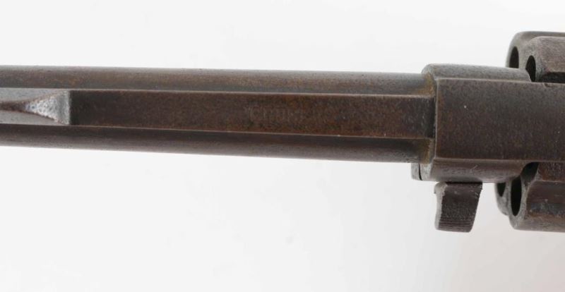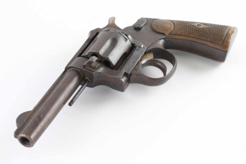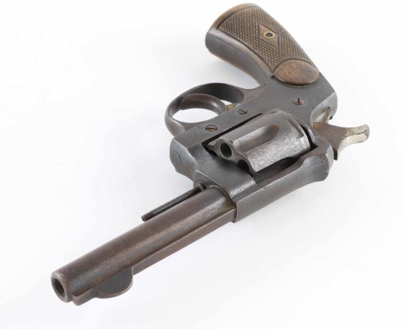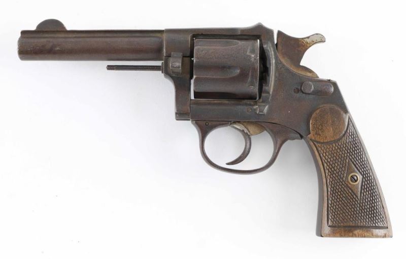 Vintage double action revolver features blued finish, 4.25" barrel, fixed sights, fluted 6 shot cylinder swings out to left, lever on left side of frame (appears to be a safety - not functional), checkered wood grips. Bore and charge holes are poor condition, rusty, with visible rifling. Metal surfaces show a uniform brown patina color, with some darker color in protected areas. Grips are good condition with wear to checkering points. Action does not operate properly. Condition is NRA Poor - (non functional - needs repair) *** C&R Firearm ***