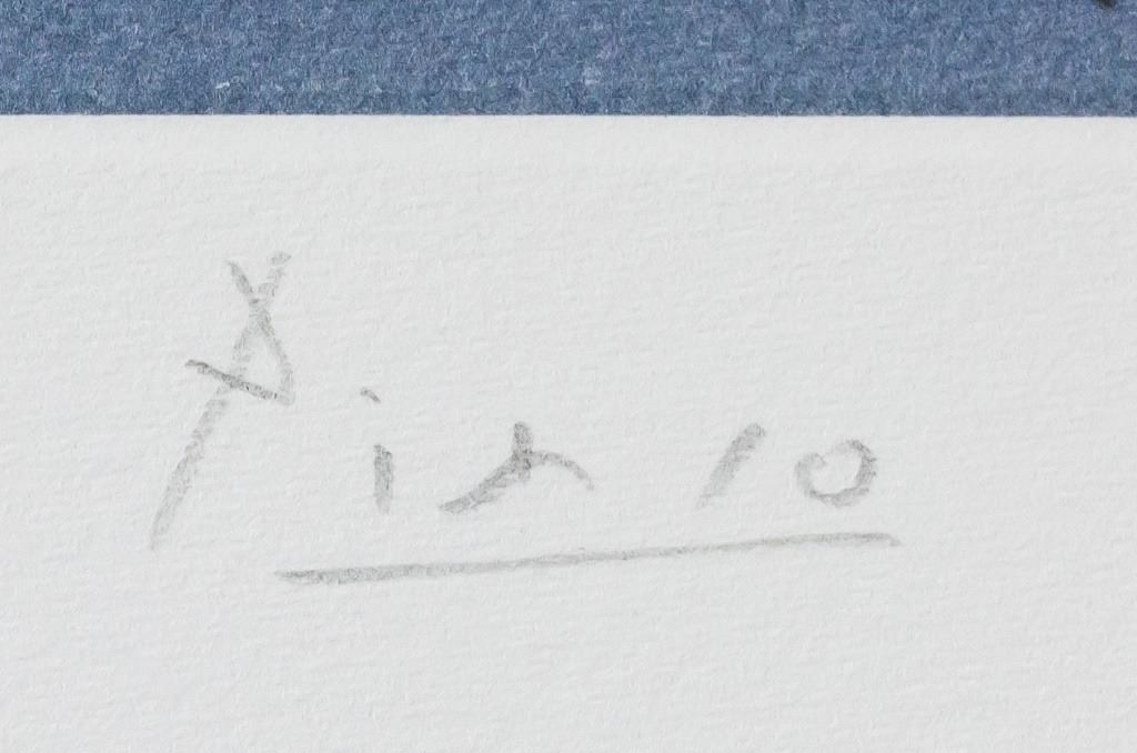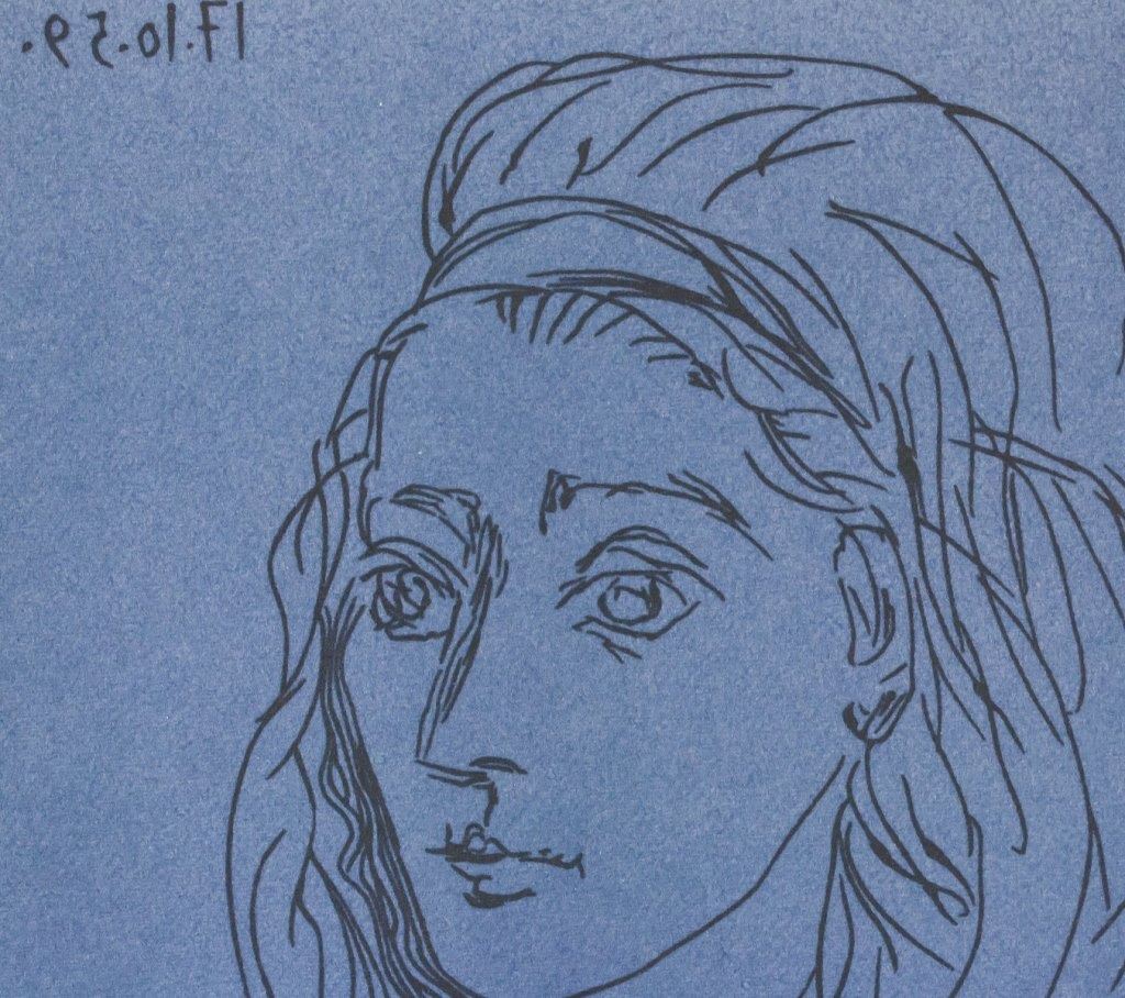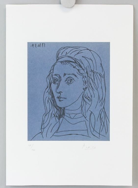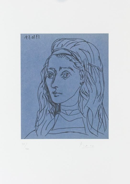 Linocut on paper. Portrait of a woman. "35/100" inscribed beneath the bottom left corner of the image. Signed "Picasso" beneath the bottom right corner of the image. Plate size: 16 x 13.5 cm (6.5 x 15.5 inches). Paper size: 30 x 21 cm (12 x 8 inches).