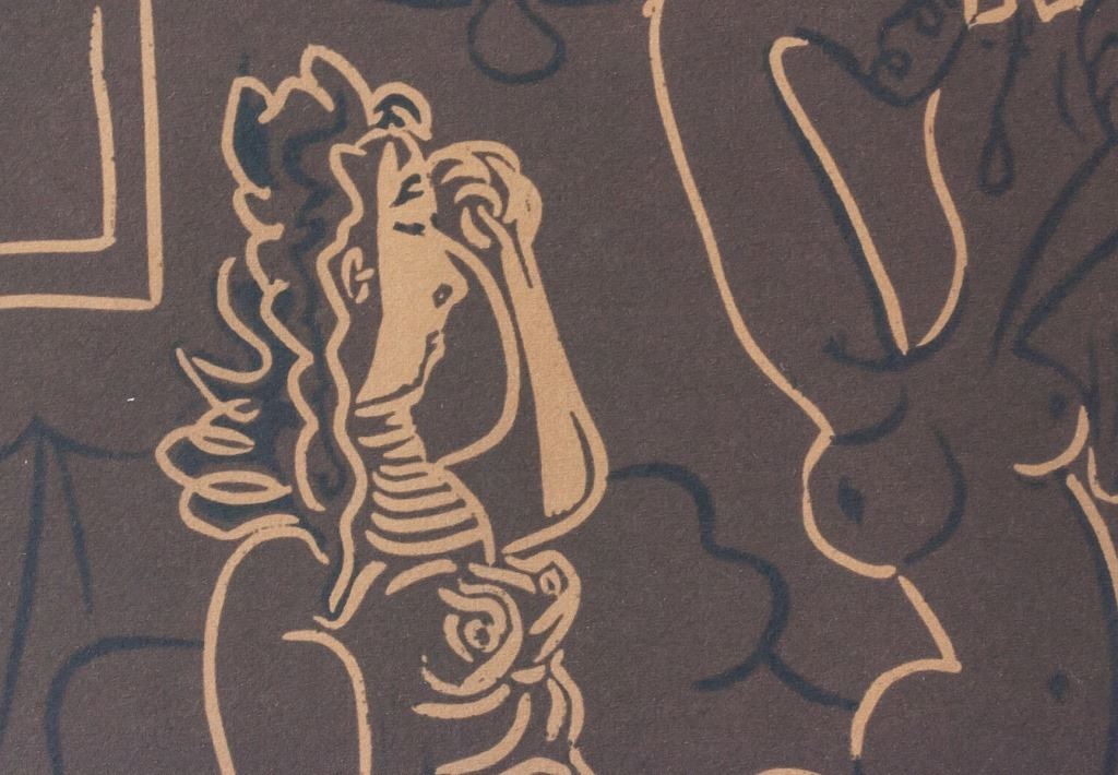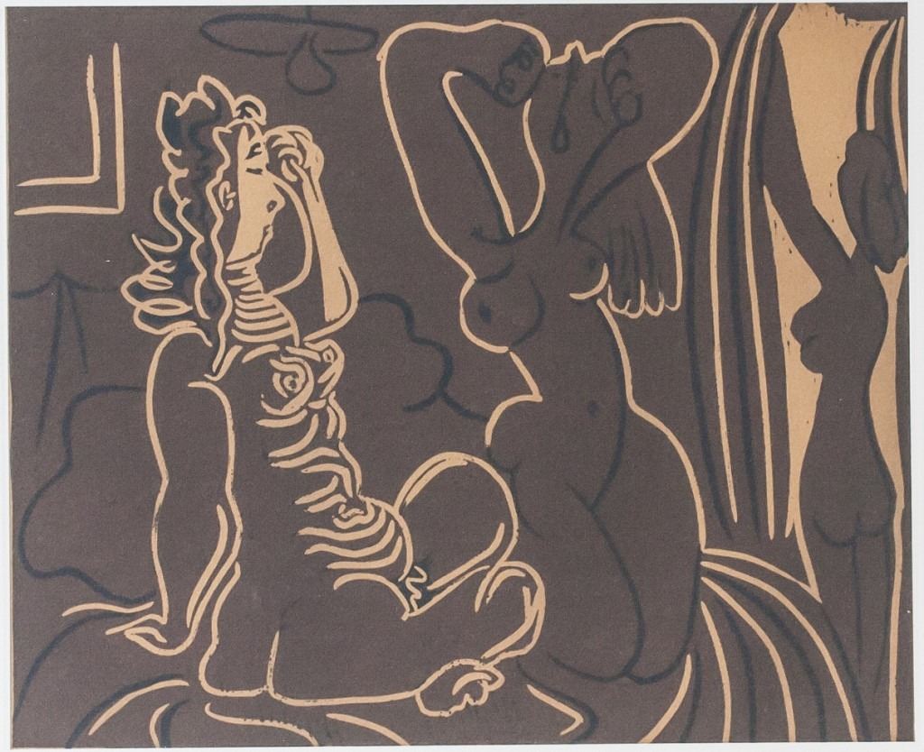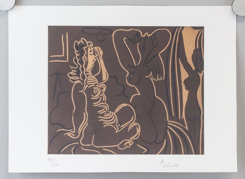 Linocut on paper. Featuring three nude woman. "84/100" inscribed beneath the bottom left corner of the image. Signed "Picasso" beneath the bottom right corner of the image. Plate size: 16 x 20 cm (6.5 x 7.5 inches). Paper size: 21 x 29 cm (8.25 x 11.5 inches). Provenance: This lot carries limited provenance from a Southern Ontario estate