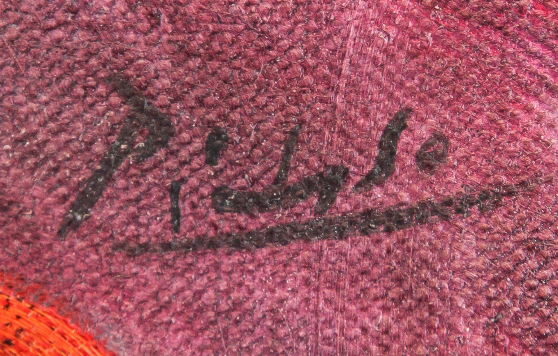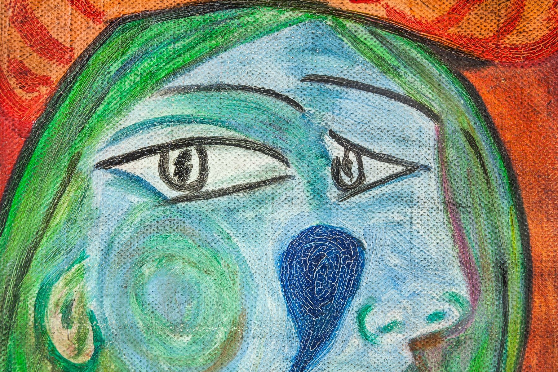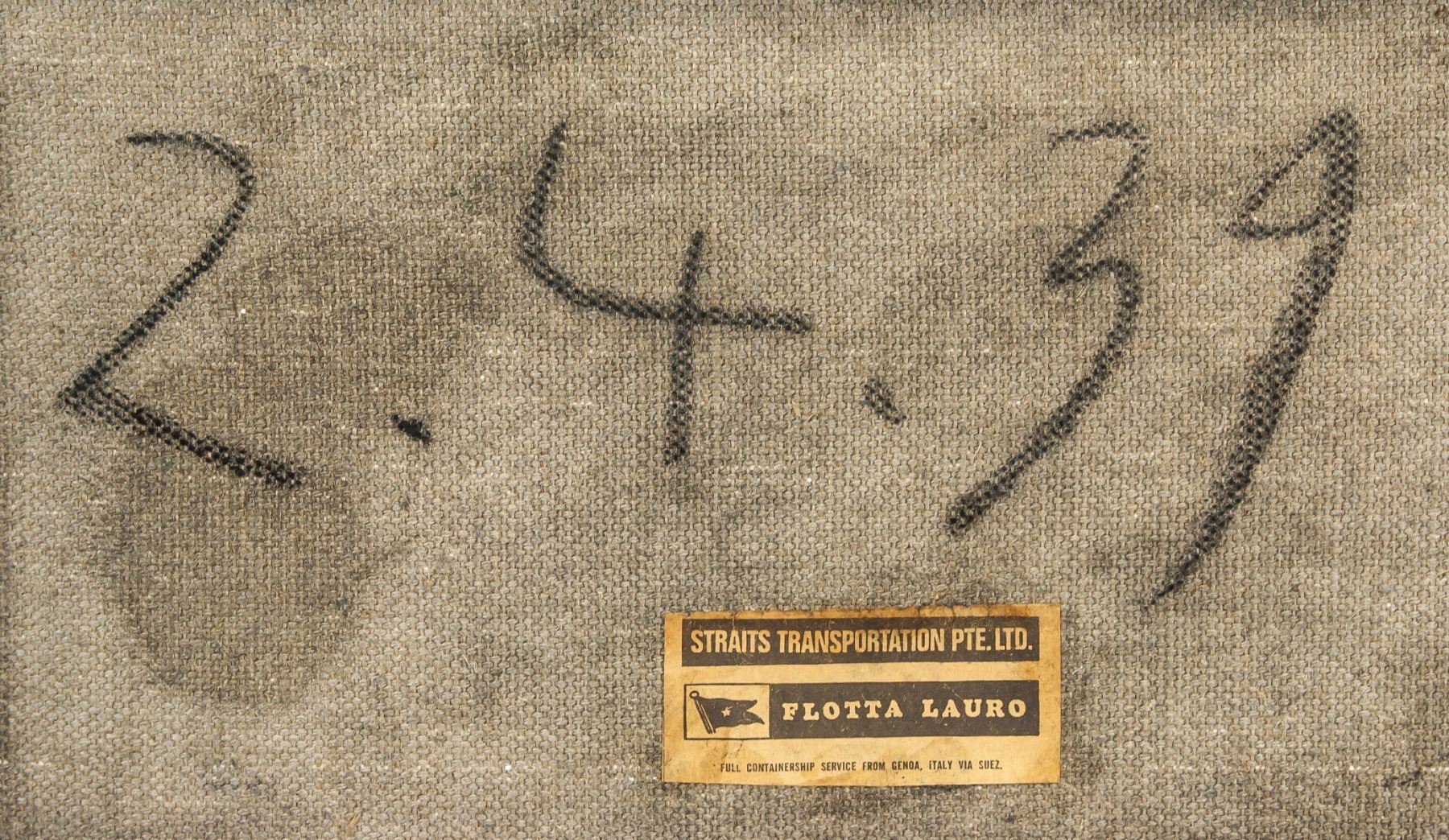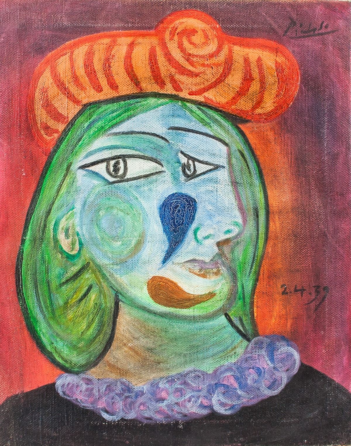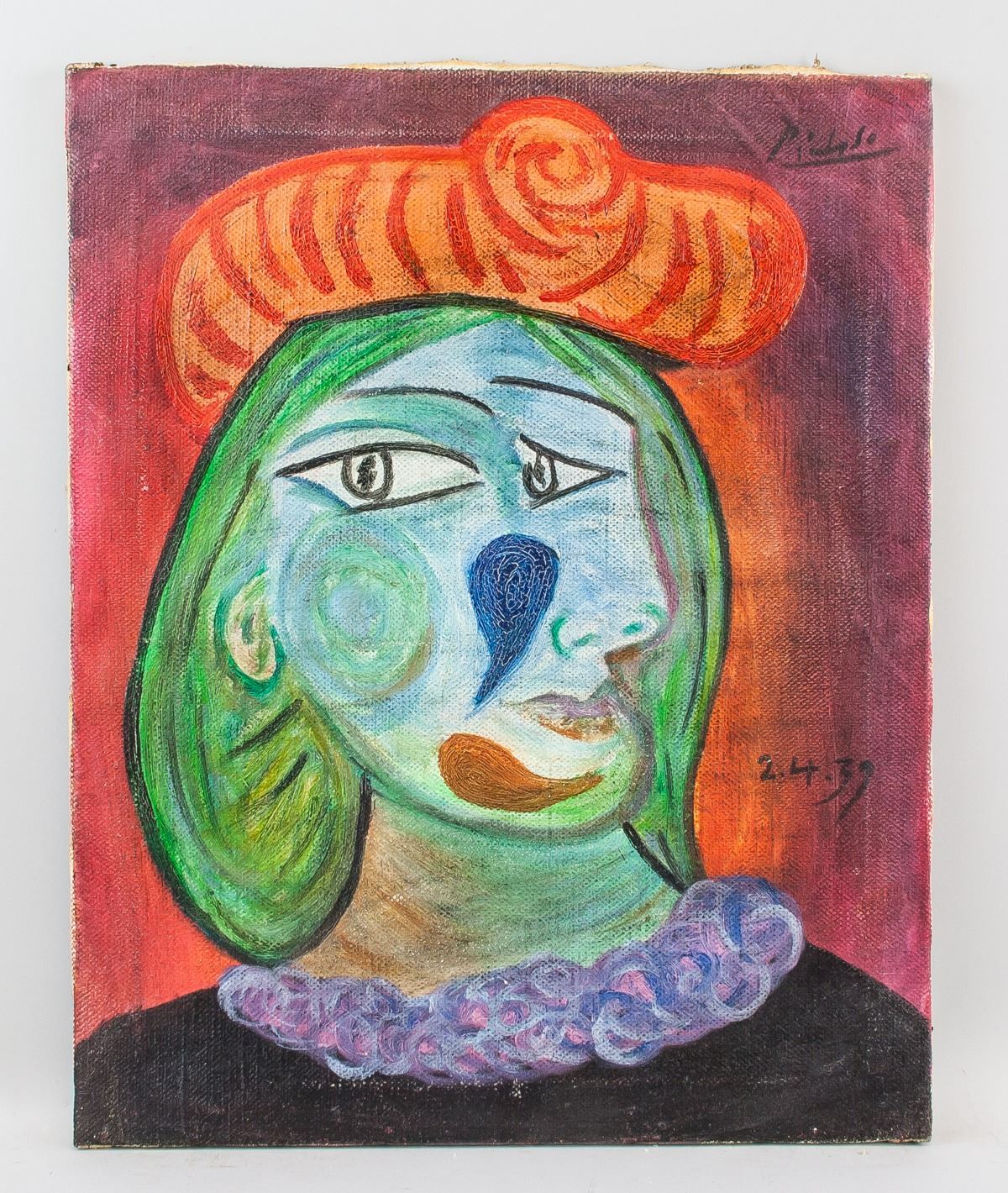 Oil on canvas. Featuring a cubist portrait. Signed Picasso on the upper right corner, bearing signature of Pablo Picasso. Inscribed 2.4.39 near right edge and verso. Label inscribed 'STRAITS TRANSPORTATION PTE. LTD.' and 'FLOTTA LAURO' and underneath, 'FULL CONTAINERSHIP FROM GENOA, ITALY VIA SUEZ.' Red stamped seal inscribed 'NOAR.' 50.5 x 40 cm (19.9 x 15.8 inches). PROVENANCE: Private collection (Toronto, ON).