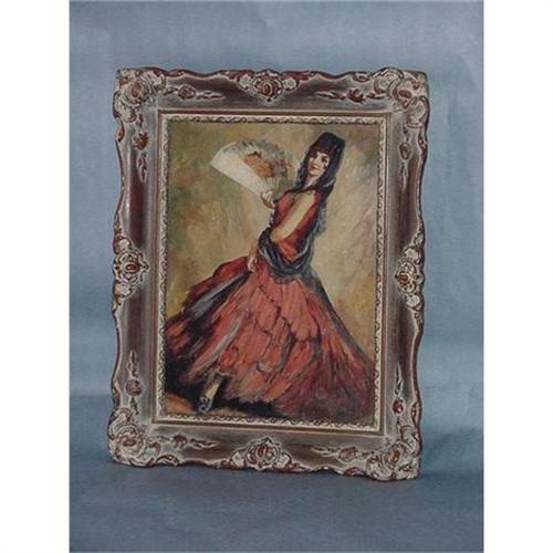 <table width="100%" border="0" cellspacing="0" cellpadding="4"><tr><td><em> </em></td></tr><tr> <td width="100%"> An oil painting on board, 12" X 15" framed. A spanish Flamingo dancer wearing a red dress and holding a fan. The painting is signed in the lower right F. Giron. Printed seal on the pack, shown. (2+) </td></tr><tr> <td> </td></tr><tr> <td>Reference #: 5597_101</td></tr><tr><td>Condition:good</td></tr><tr><td>Year:mid 20th century</td></tr><tr><td>Title:Spanish Dancer SKU 5597</td></tr><tr><td>Location:Fort Lauderdale, Florida</td></tr></table>
