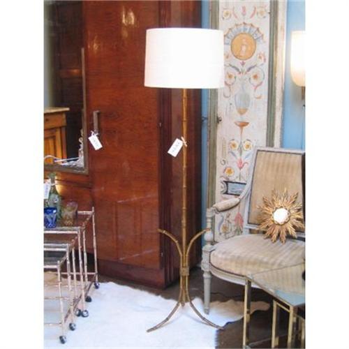 Unique Bagues style forged iron floor lamp with a tripod centerfoot, out of gilded iron bamboo. Rewired, central rope detail, rattan drum shade.