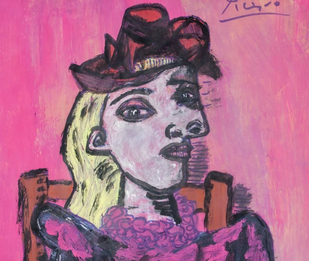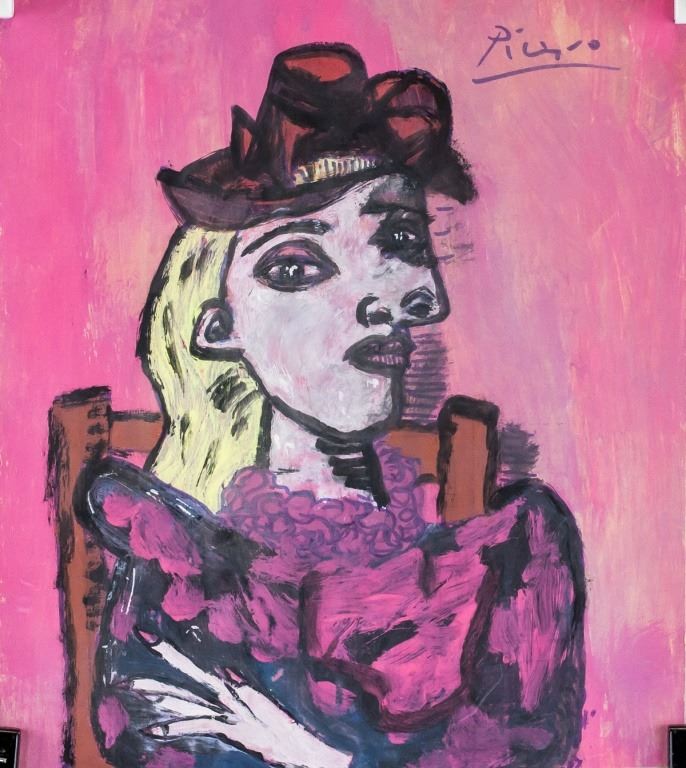 Gouache on paper. Featuring a cubist portrait of a woman. Signed Picasso on the lower upper right corner. Stamped 758 PARIS - Hotel des Vealez Rue Douot C.L.C on verso. 28 x 25 cm (11 x 9.75 in). Provenance: This lot carries limited provenance from an Upper New York estate