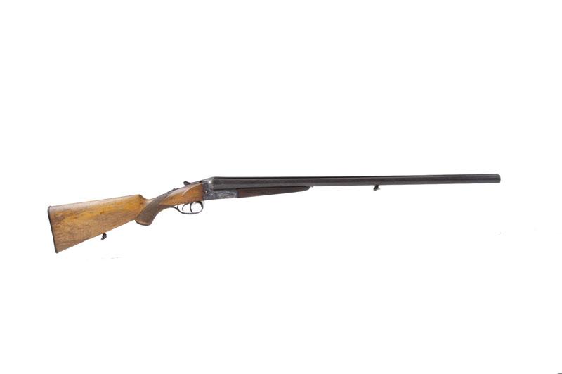 Spanish Guild SxS Shotgun 12 ga SN:62683 Double barrel field grade shotgun made in Spain by Kalmar in Colibre. Blued barrels, case colored receiver with internal hammers, checkered wood pistol grip stock with cheek piece, hard rubber butt plate, checkerDouble barrel field grade shotgun made in Spain by Kalmar in Colibre. Blued barrels, case colored receiver with internal hammers, checkered wood pistol grip stock with cheek piece, hard rubber butt plate, checkered forearm. Receiver showsdouble lugs with Greener cross bolt, extractors, cocking indicators, and double triggers. Sling swivels attached, 28" barrels with good bores and working actions. Condition: Good with some use. Stock looks to beoriginal and shows lots of use. Receiver is very good with vivid case color. Shows engraving of birds on the sides of the receiver.