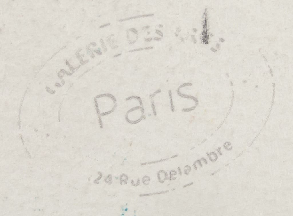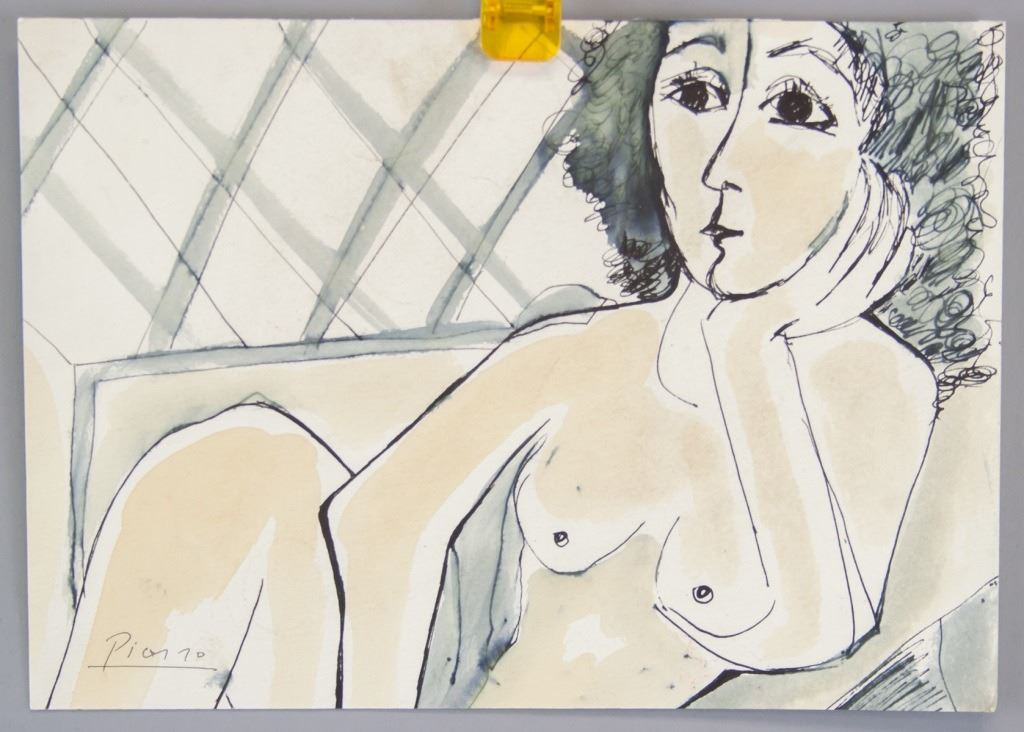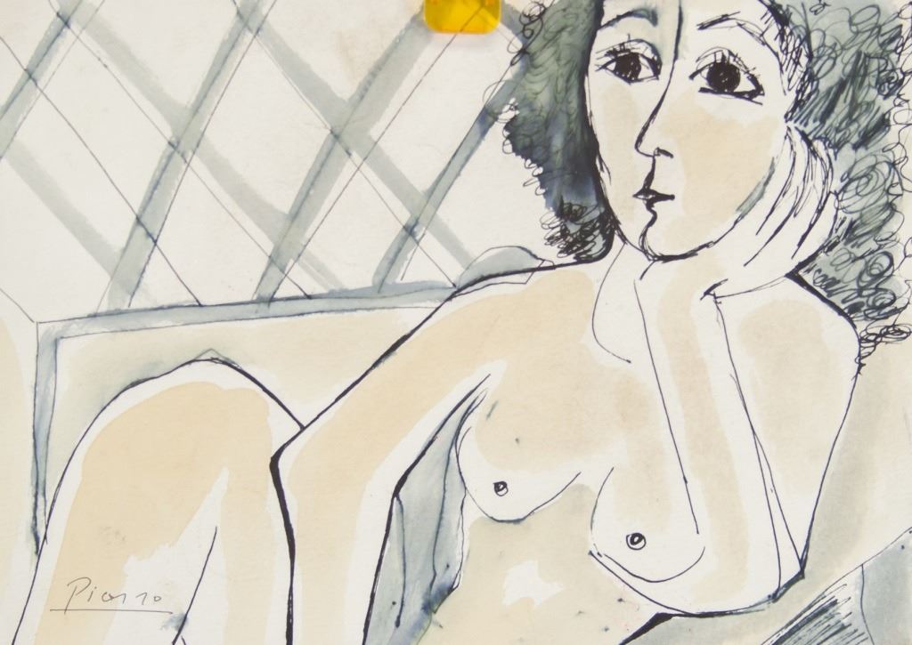 Ink and watercolor on paper. Featuring seated nude woman with her head propped on her hand. Signed "Picasso" to the bottom left corner. Stamp on verso reads "Galerie [illegible] Paris". 21 x 29 cm (8.3 x x 11.5 inch).