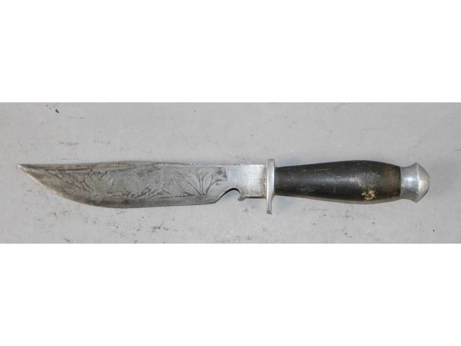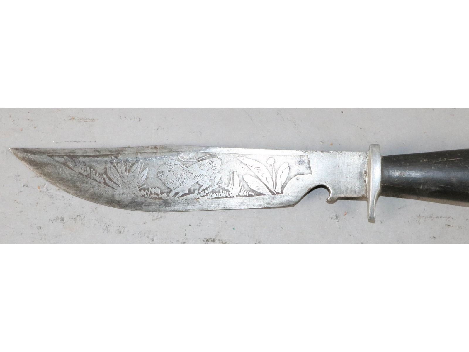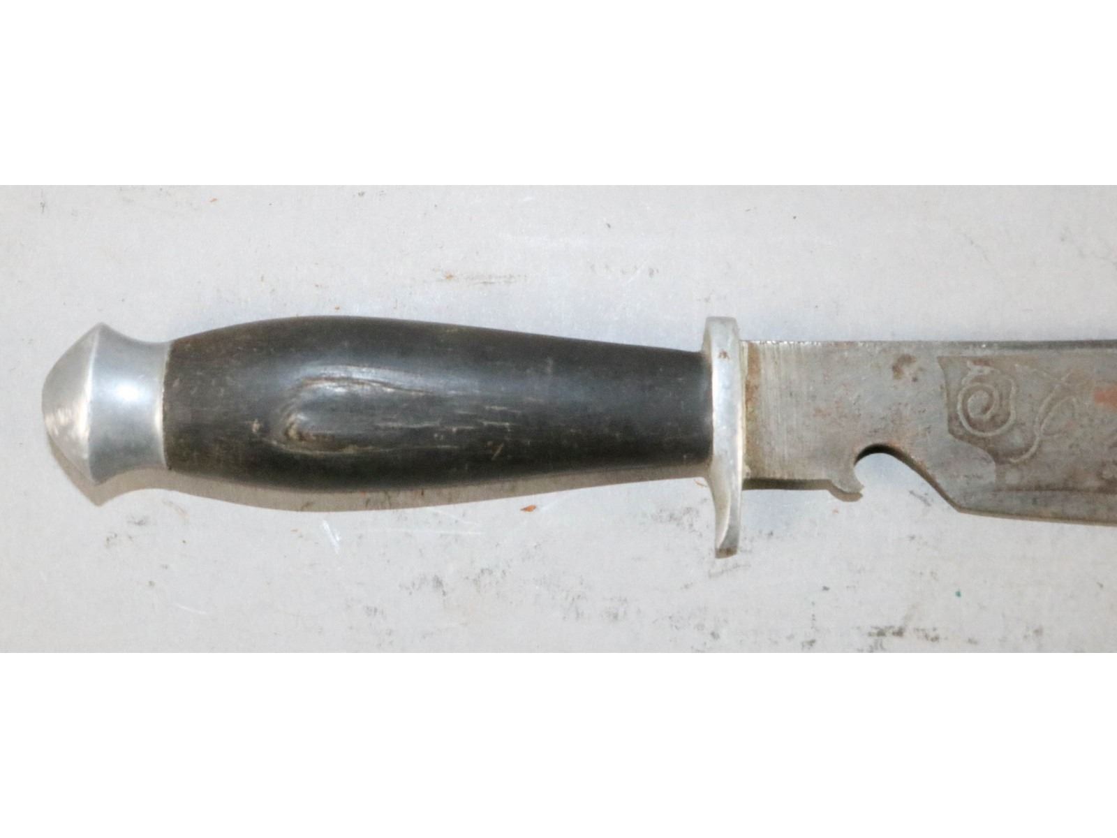 Knife with Spanish saying on the blade. Blade and handle are worn. Sheath leather is stiff. Overall fair condition. See photos.