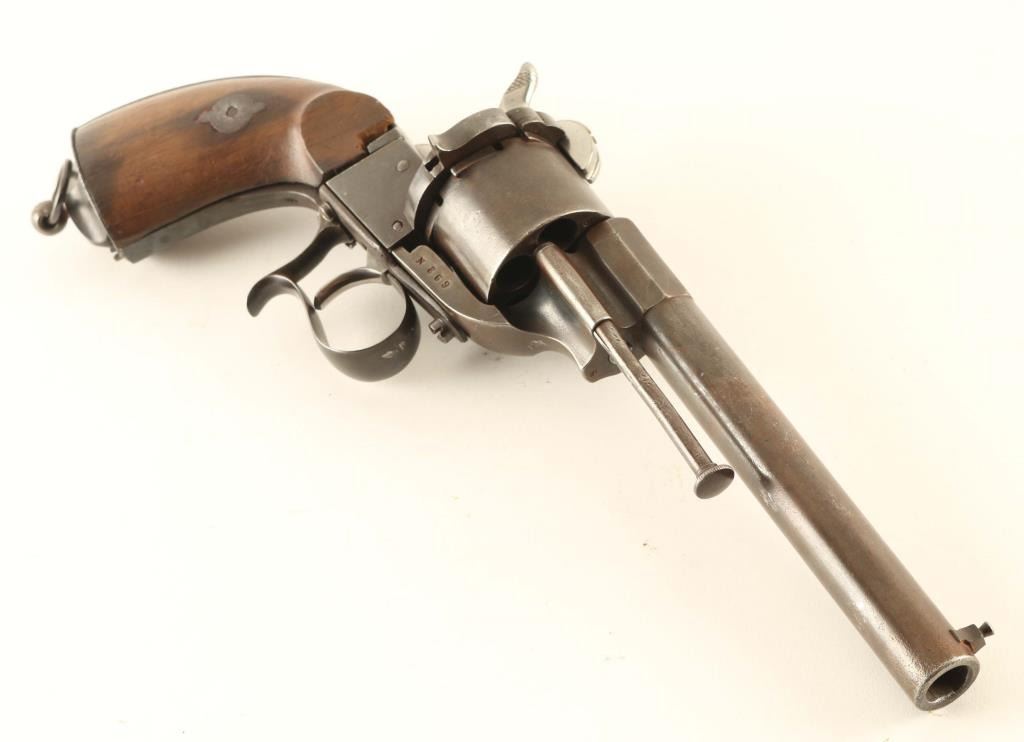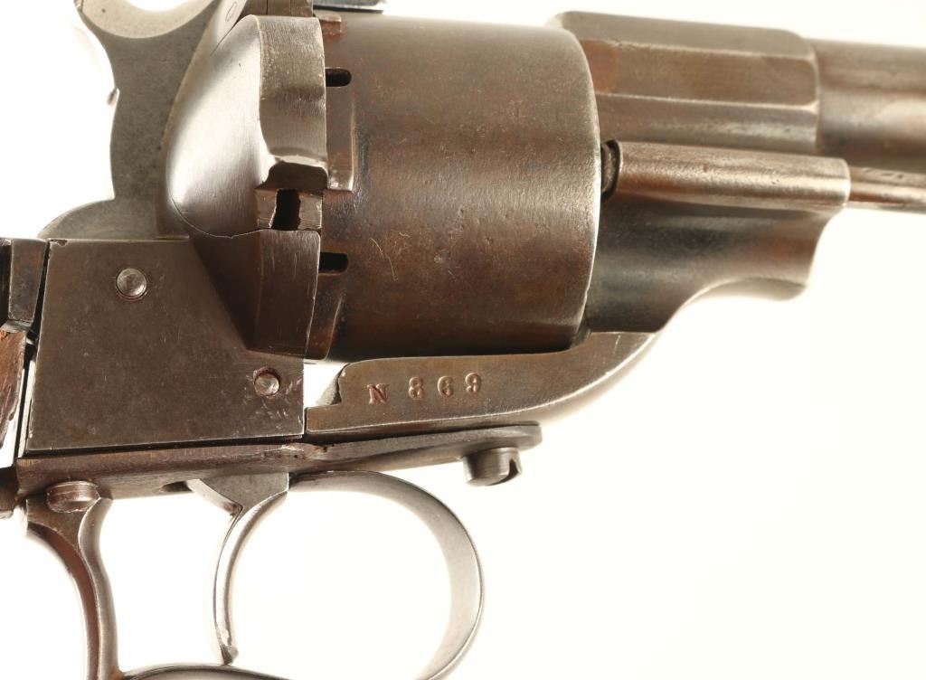SN: N869 Features approx 6.25" barrel, six shot cylinder, single action, side loading, fixed sights, lanyard ring at butt. Bore is poor condition, light rust, little or no rifling. Charge holes have light rust. Metal finish is a grayish brown color, dark and mostly even with mottled areas on barrel, bare metal on sharp edges. Trigger and Barrel appear nickel plated and in very good condition. Grips are fair condition with some shrinkage, poor fit, some missing wood. Action does not operate properly. Action operates intermittently, sometimes fails to rotate cylinder on cocking. Condition is NRA Fair *** Antique Firearm ***