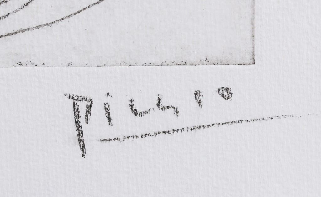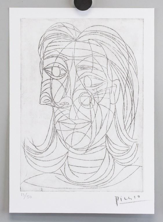 Linocut etching on paper. Featuring geometric portrait of a woman. Signed "Picasso" in the bottom right corner. "13/50" inscribed in the bottom left corner. "Editions d'Orsay" stamped on verso. "No 24" inscribed on verso. 28 x 20 cm (11 x 7.75 in). Provenance: This lot carries limited provenance from a Southern Ontario estate.