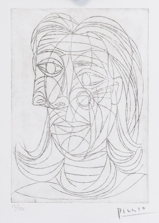 Linocut etching on paper. Featuring geometric portrait of a woman. Signed "Picasso" in the bottom right corner. "13/50" inscribed in the bottom left corner. "Editions d'Orsay" stamped on verso. "No 24" inscribed on verso. 28 x 20 cm (11 x 7.75 in). Provenance: This lot carries limited provenance from a Southern Ontario estate.