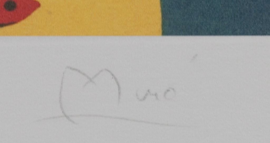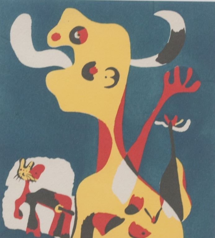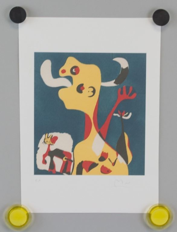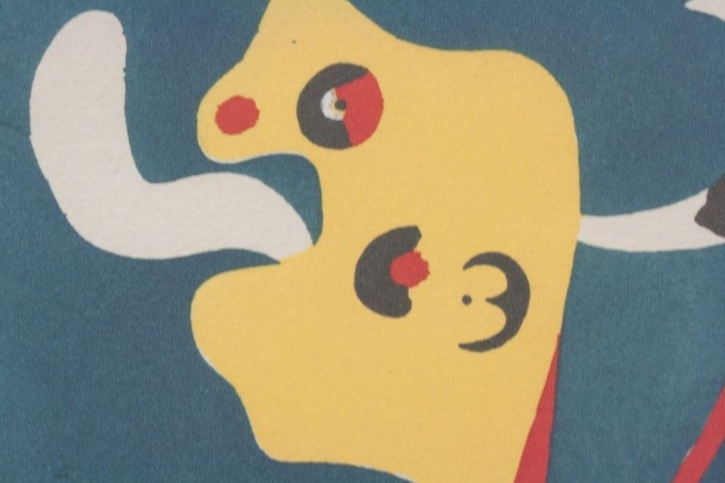 Linocut on paper. Featuring surrealist composition against a dark blue background. Signed "Miro" to the bottom right. "E.A" inscribed to the bottom left. Image size: 18.5 x 16.25 cm (7.3 x 6.4 inches). Sheet size: 29 x 21 cm (11.5 x 8.3 inches).