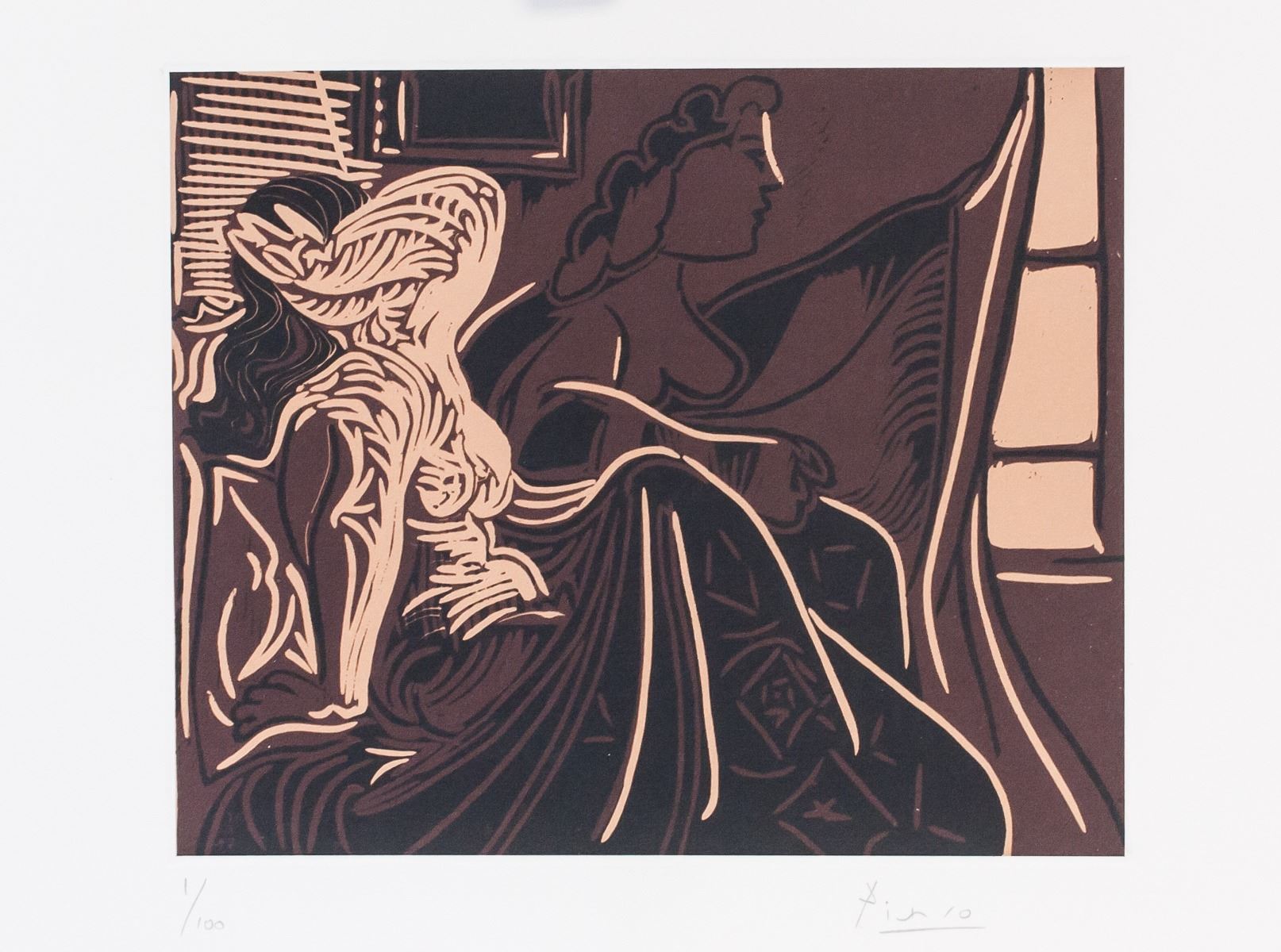 Lithograph on paper. Featuring two women in a dark room. One woman is drawing back the curtains to let in the light. Signed "Picasso" to the bottom right, with "1/100" inscribed to the bottom left. 21 x 29 cm (8.25 x 11.25 in). Provenance: This lot carries limited provenance from a Southern Ontario estate.