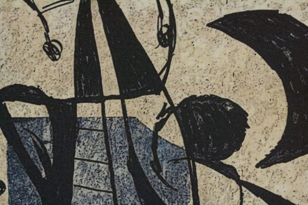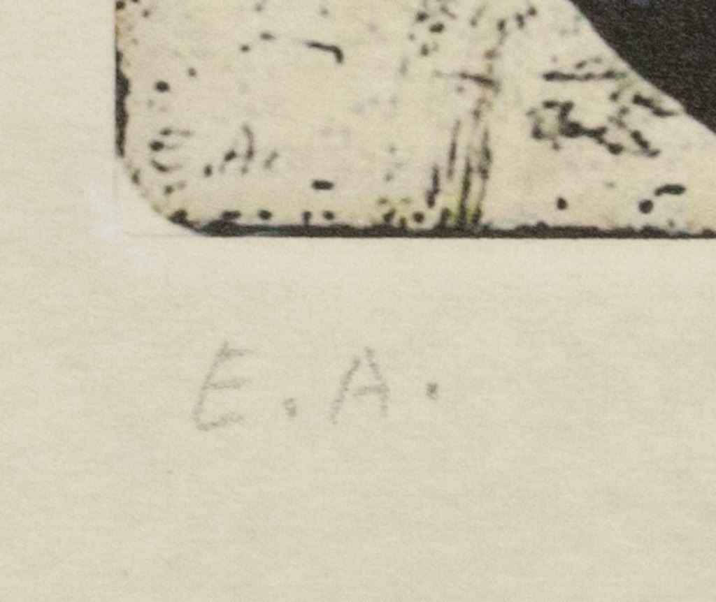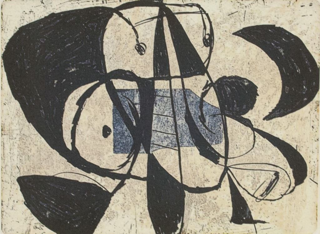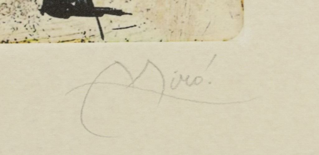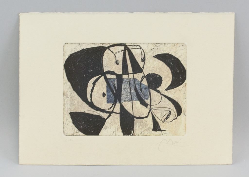 Lithograph on paper. Featuring abstract composition. Signed "Miro" to the bottom right. "E.A" inscribed to the bottom left. Provenance: This lot carries limited provenance from a Private Italian collection. Plate size: 13 x 17 cm (5 x 6.75 inches). Sheet size: 21.5 x 30 cm (8.5 x 11.5 inches)