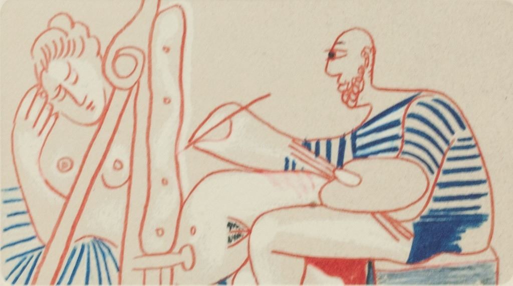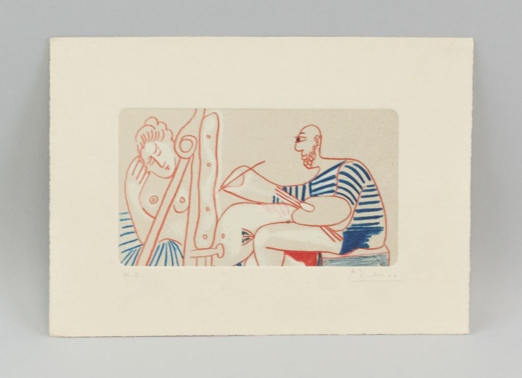 Lithograph on paper. Featuring a man drawing a nude portrait fo a woman. Signed "Picasso" to the bottom right. "H.C." inscribed to the bottom left. Plate size: 11 x 20 cm (4.5 x 8 inches). Sheet size: 21.5 x 30 cm (8.5 x 11.75 inches).