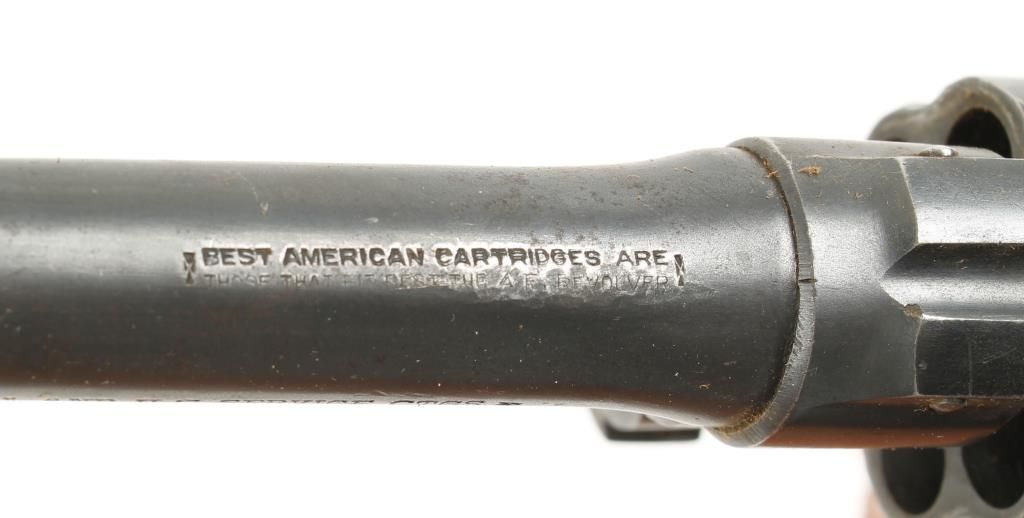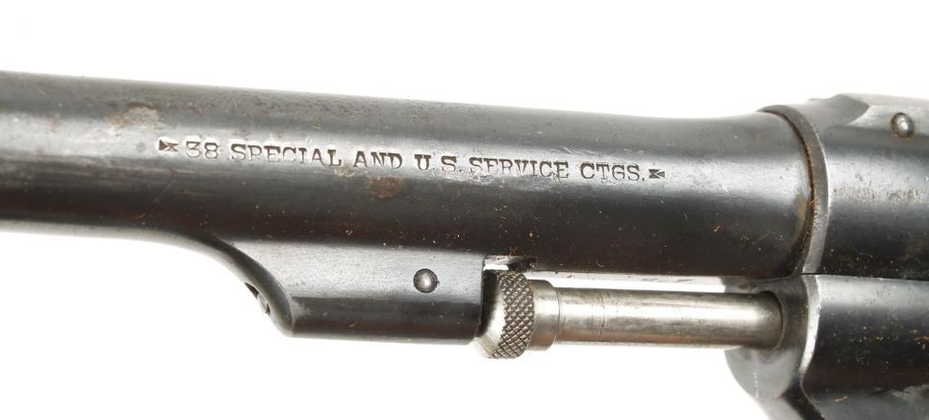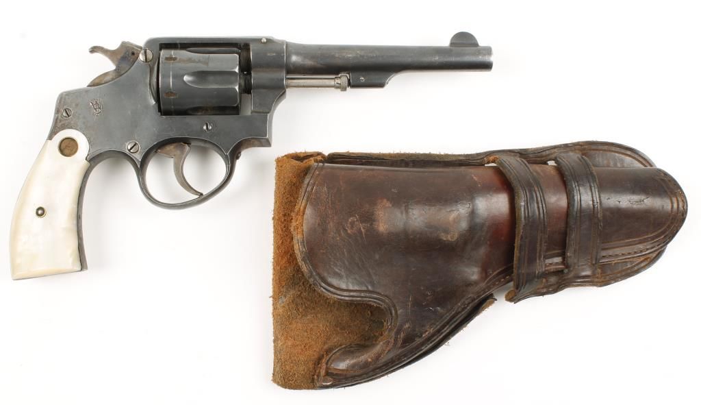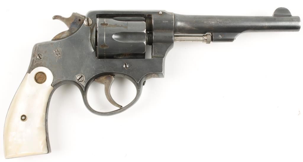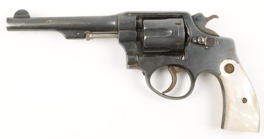 Spanish made copy of a Smith & Wesson M&P with 5-1/4" barrel. Blued finish, case colored hammer and trigger, pearl grips with gold medallion and grooved receiver for rear sight. Good bore and action. Includes Mexican double loop leather holster. Condition: Good showing pinpricking and thinning bluing.