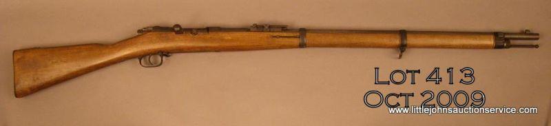 Spanish Mauser 71-84, # 425, 11mm cal., 31.5" barrel, smooth walnut stock. Rifle is in fair condition overall, with pitted metal under a re-blued finish. Stock is a new replacement stock. Est. $75-$150.