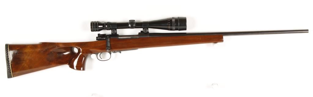 Custom made varmint rifle with 24" barrel. Blued finish, pistol grip thumb hole wood stock, no sights, fitted with early Redfield 4-12 power scope with adjustable objective. Fair bore and good action. Condition: Good to very good showing light scratching on wood. *Curio & Relic Firearm*
