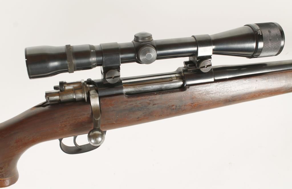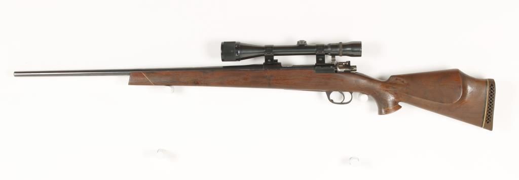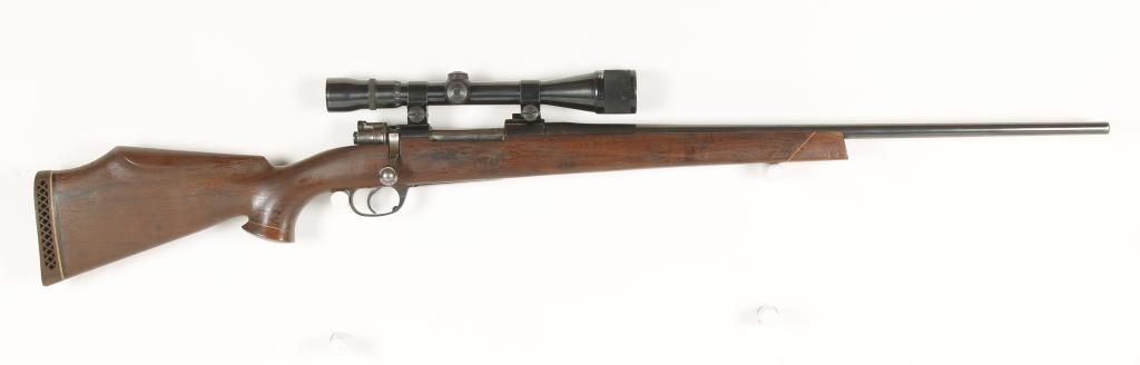 Custom sporterized Spanish military rifle with replaced 24" barrel. Blued finish, pistol grip wood stock with cheek piece, no sights and fitted with early unknown maker 4-12 power scope with adjustable objective. Dark bore and good action. Condition: Fair to good showing light pinpricking on metal and wood shows wear.