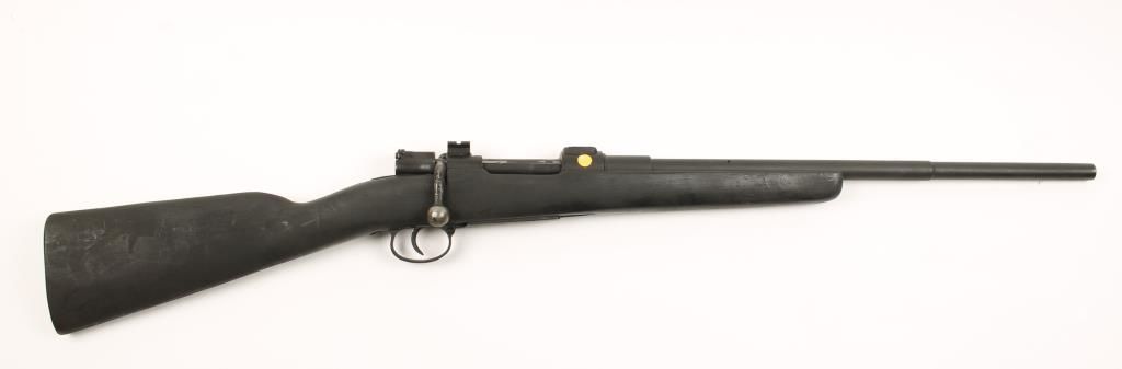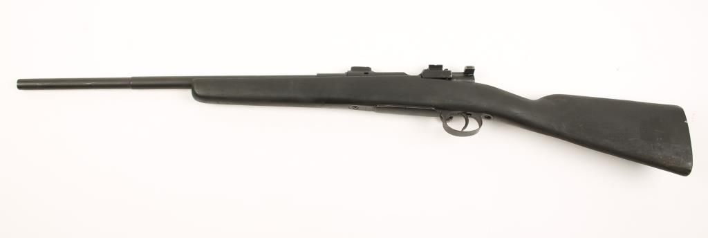 Sporterized bolt action box magazine rifle. Matching numbers on receiver, barrel, floorplate, bottom metal and bolt. Different number on the safety. Bright bore with good visible rifling. Has a metal rear scope base and a Bondo front scope base. Stock has been painted black. All the metal appears to have been parkerized with wear on the edges, bolt lug ways, extractor and the bolt handle. Action works well. Condition: Fair. *Curio & Relic Firearm*