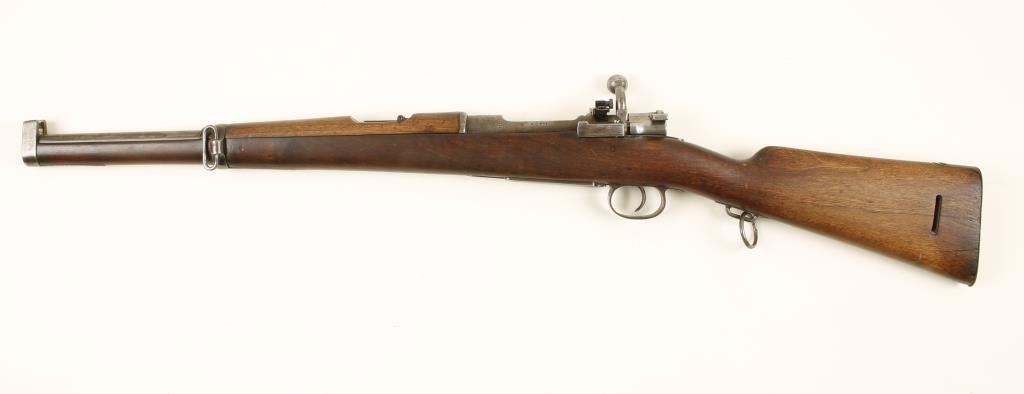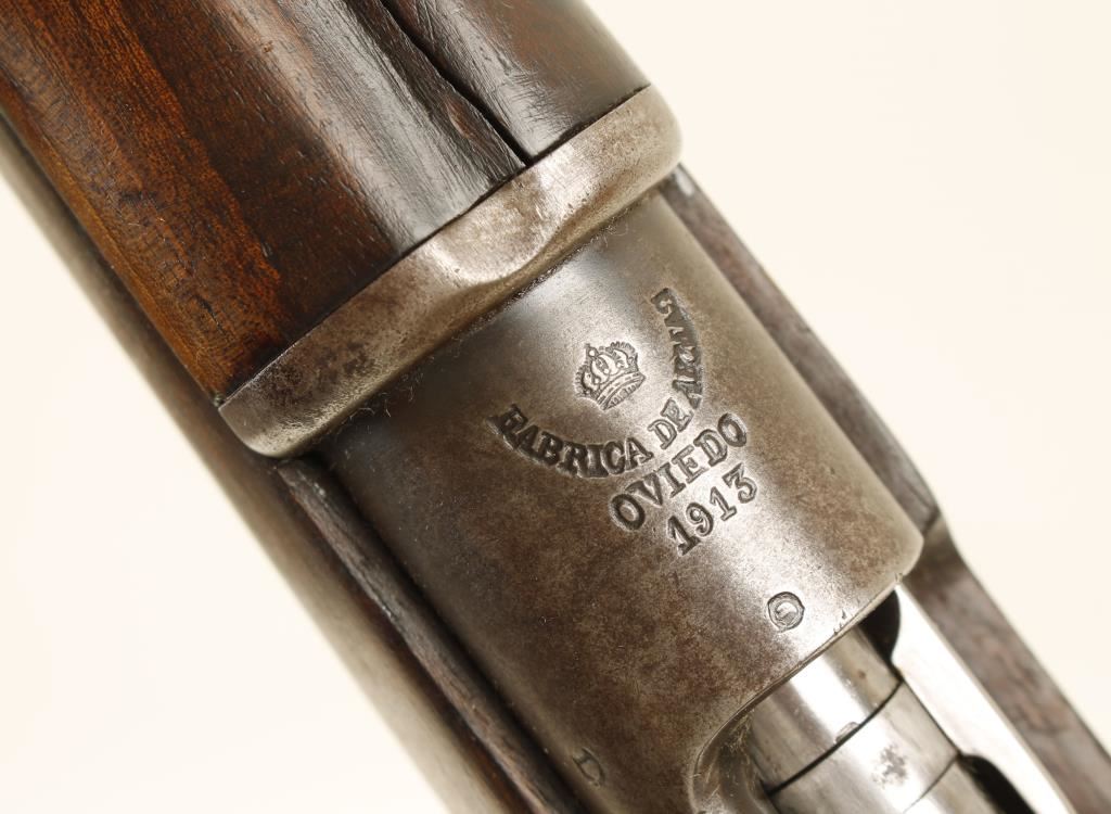 Carbine length full stocked Spanish military 7x57mm rifle by Oviedo. Features a 17.5" barrel, Mannlicher style stock, dot front sight, Williams rear peep sight, bent bolt, saddle ring & metal butt plate. Condition is good to very good as missing factory rear sight and very little finish remaining. ***Modern Firearm***