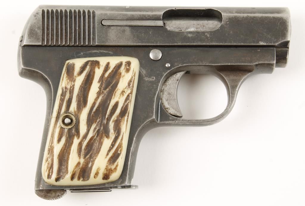 Spanish made single action semi auto pocket pistol with 2 1/4" barrel. Blued finish, plastic stag pattern grips, and no sights. Fair bore and action. Includes 1 magazine. Condition: Fair showing 60% original bluing and light pitting on frame. *CURIO & RELIC FIREARM*