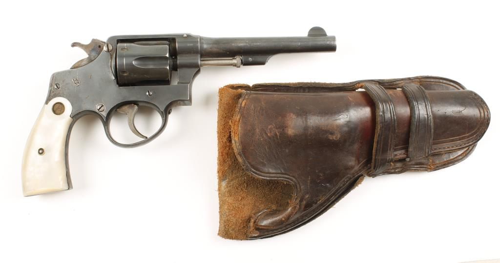 Spanish M&P Copy Cal .38spl SN:7996 Spanish made copy of a Smith & Wesson M&P with 5-1/4" barrel. Blued finish, case colored hammer and trigger, pearl grips with gold medallion and grooved receiver for rear sight. Good bore and action. Includes Mexican double loop leather holster. Condition: Good showing pinpricking and thinning bluing.