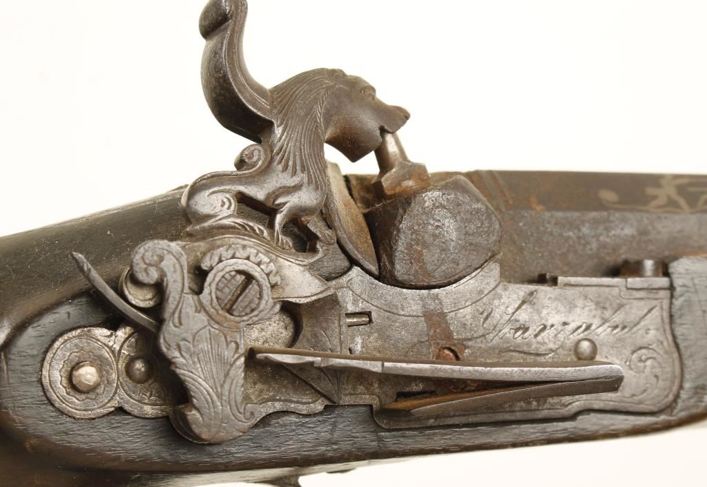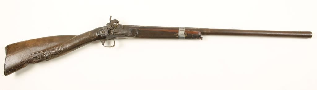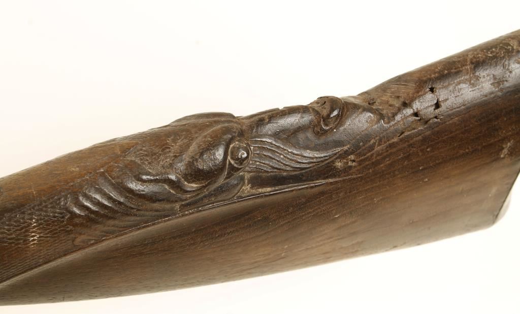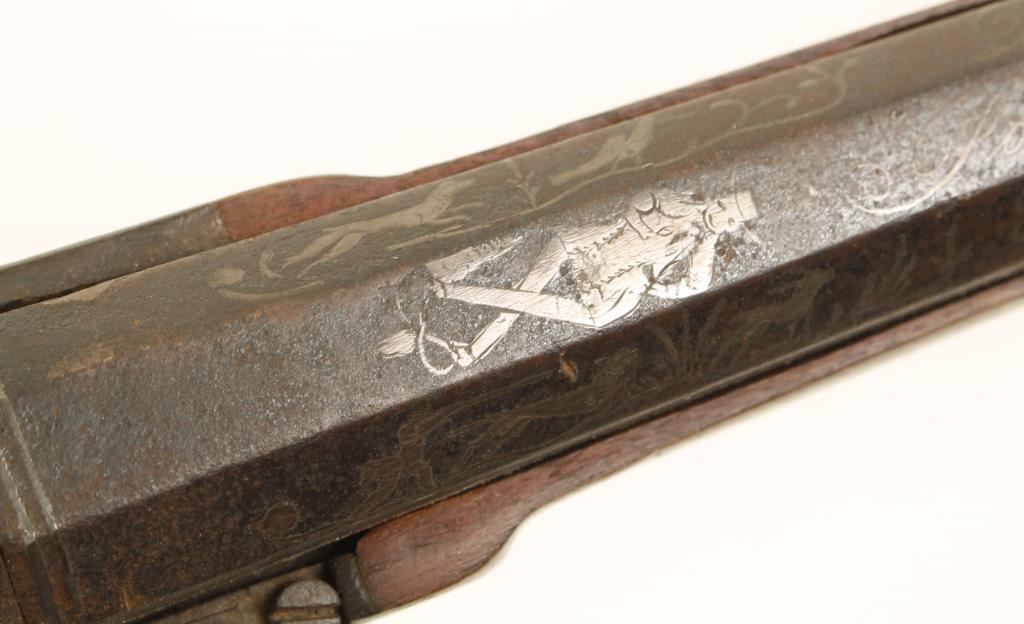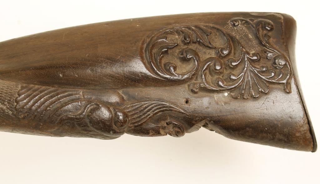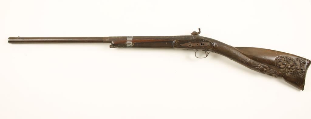 Percussion single-shot gun with a 25" part octagon silver inlaid barrel, a lock,plate with the mainspring on the outside and an ornately carved and checkered buttstock. There is engraving on the lock plate, side plate, trigger guard and buttplate. Metal finish is all brown surface rust patina. The forend has had a repair with new wood. Bore is filthy and pitted. Action is missing some parts and may not work. Condition is poor. *Antique Firearm*