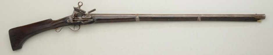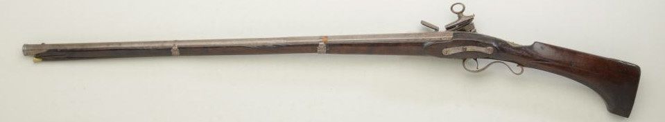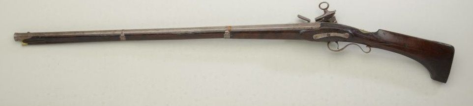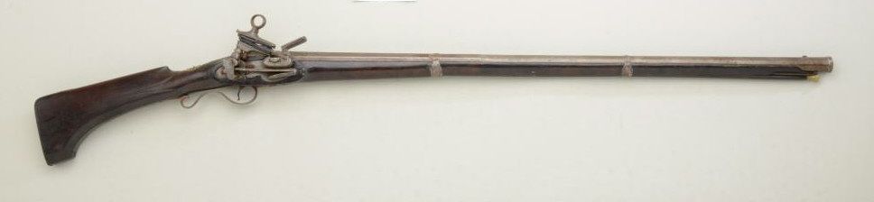 Spanish Miquelet flintlock fowler circa late 18th or early 19th century; 48-1/4” overall with a 34” barrel, of approx. 12 gauge smoothbore, the barrel is nicely silver inlaid at the breech and shows a maker’scartouche with a five-pointed crown, the letters “EUQ, CA, Jor IP”; there is a marking stamped just behind the trigger guard in the stock which may be a collection ID but not quite visible; the gun shows iron mountings,lightly engraved lock, wood is good with small losses at the top edge, some chips and breaks along the edge of the fore end; the butt stock portion is in the Catalan style; generally good overall; some light rust anderosion; there is a marking at the left rear breech “AP” with a small proof. Est.: $750-$1,500.
