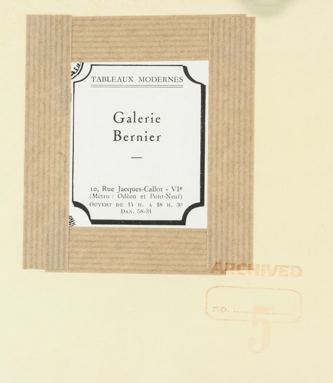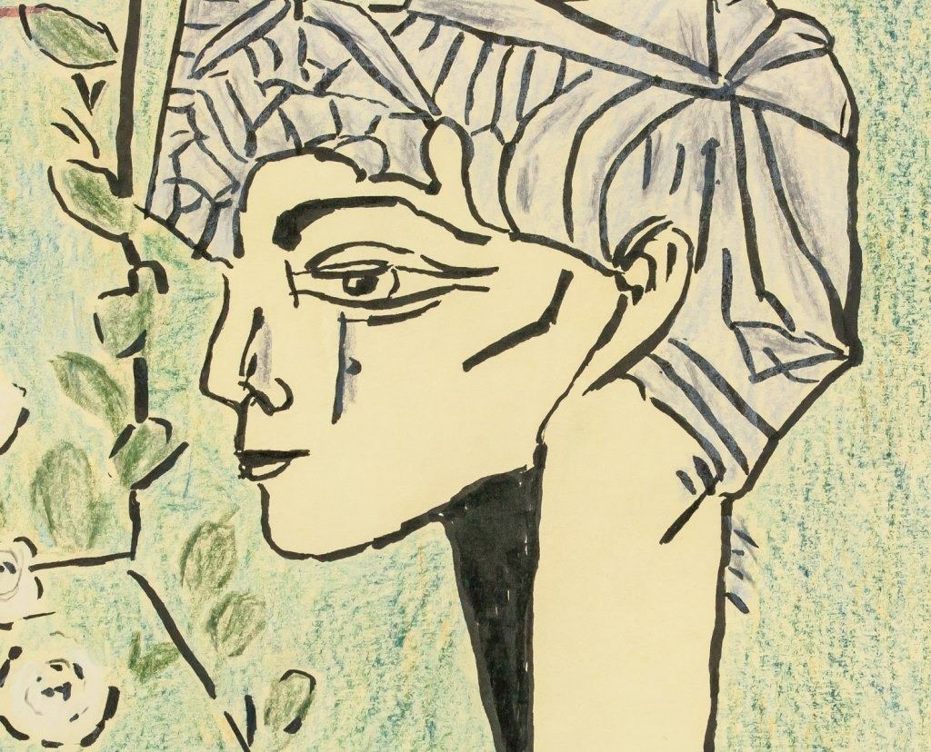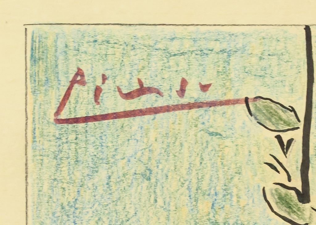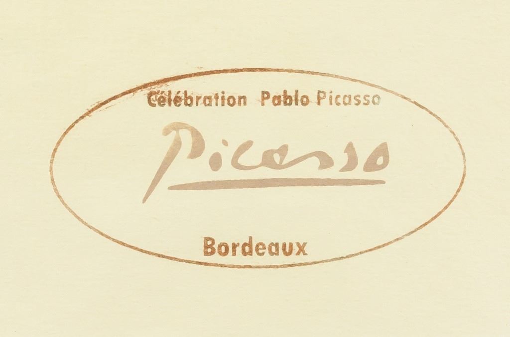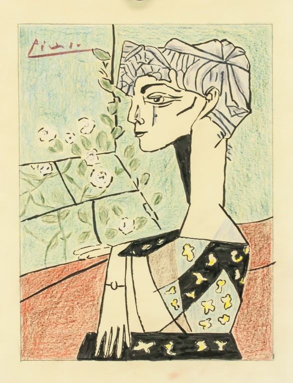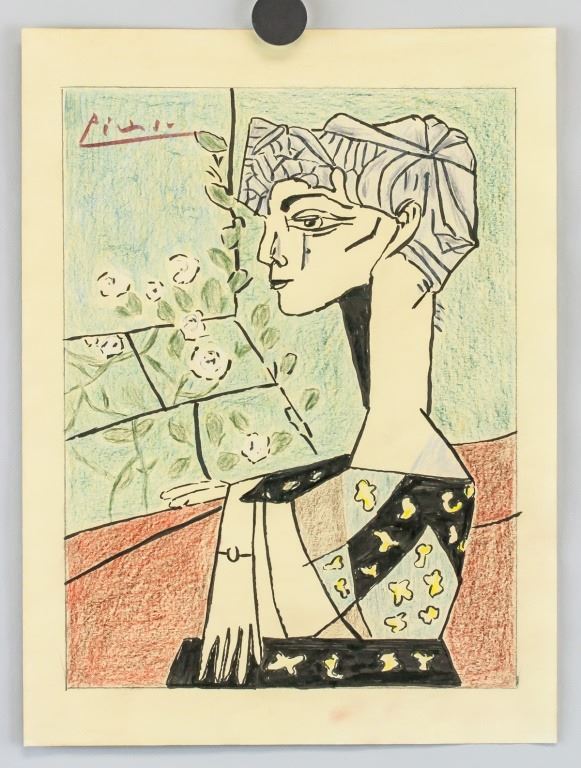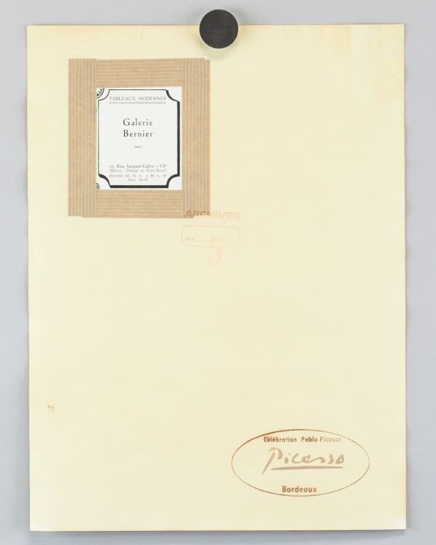 Mixed media on paper. Featuring cubist portrait. Signed "Picasso" in the top left corner. Paper affixed to verso reads "TABLEUX MODERNES Galerie Bernier 10, Rue Jacques-Callot - VIe (Metro: Odeo et Pont-Neuf) OUVERT DE 14 H. A 18 H. 30 DAN. 58-31". Stamp on verso reads "ARCHIVED NO....5....". Stamp on verso reads "Celerabtion Pablo Picasso Bordeaux". 32 x 24 cm (12.5 x 9.5 in). Provenance: This lot carries limited provenance from a Private French collection