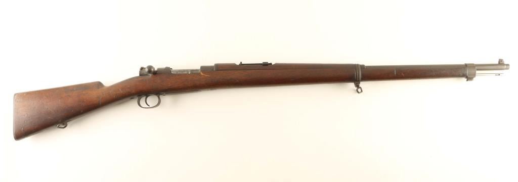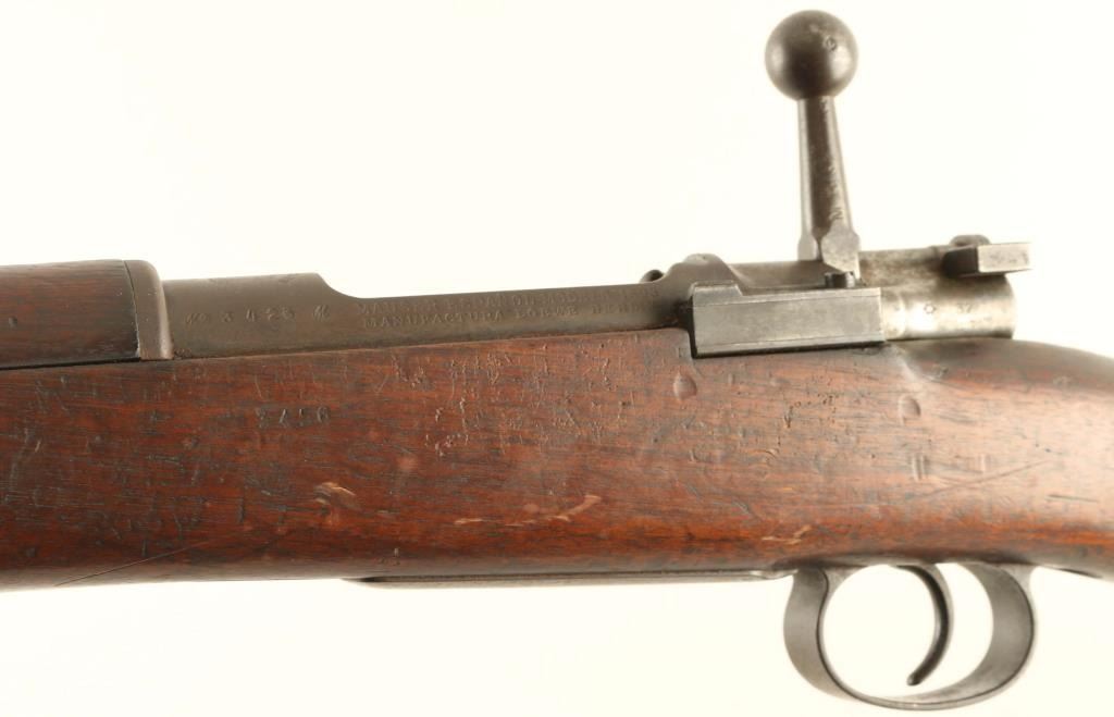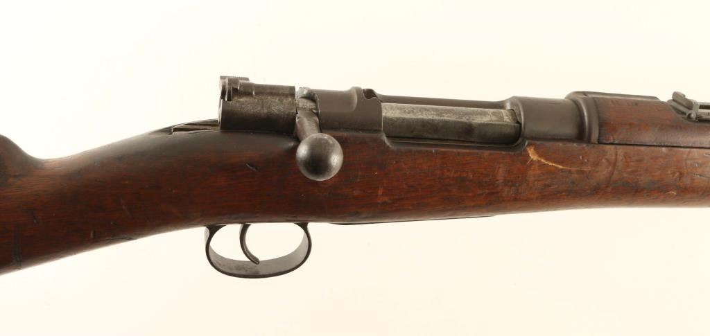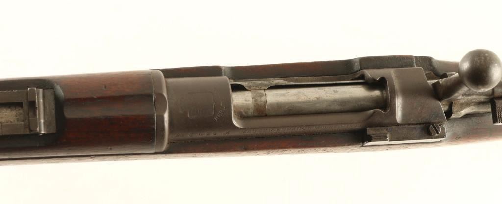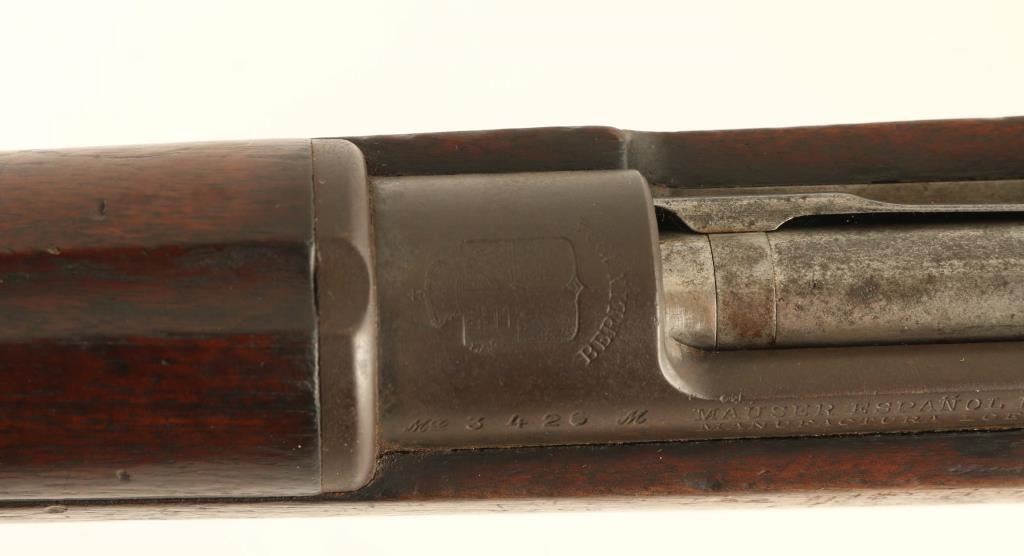 Spanish military rifle made by Ludwig Loewe, Berlin Germany circa 1894. Features 29" barrel, sling swivels, manual safety, military style sights, cleaning rod under barrel. Bore is good condition, dark with strong rifling. Retains 85% blue, turning patina brown overall. Bolt is in the white with brown color at knob. Wood is good condition with many small dents and nicks. Spanish crest on receiver and stock. Lowe star stamp on bolt shroud. Bolt assembly numbers do not match receiver. No import marks observed. Condition is NRA Good *** Antique Firearm ***