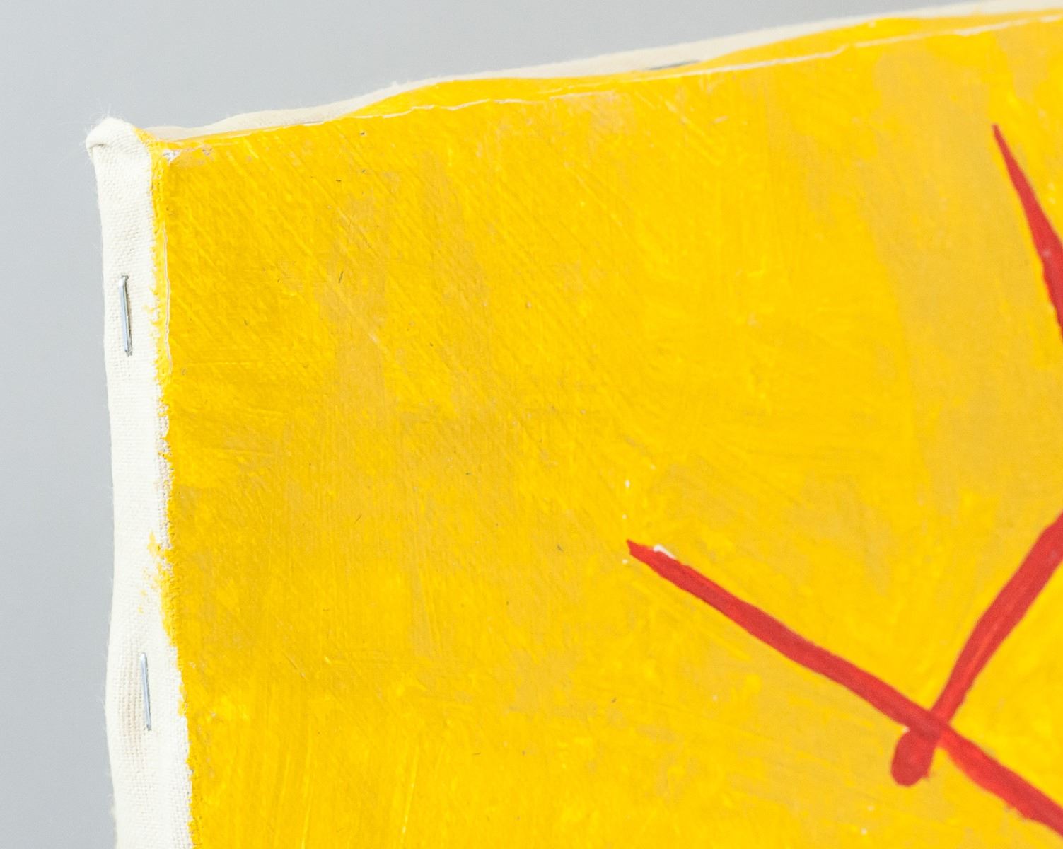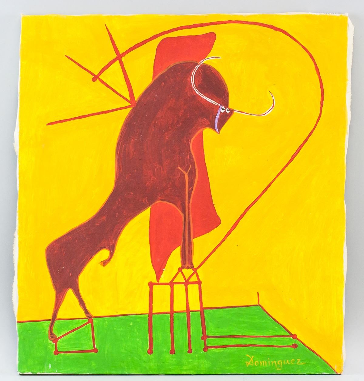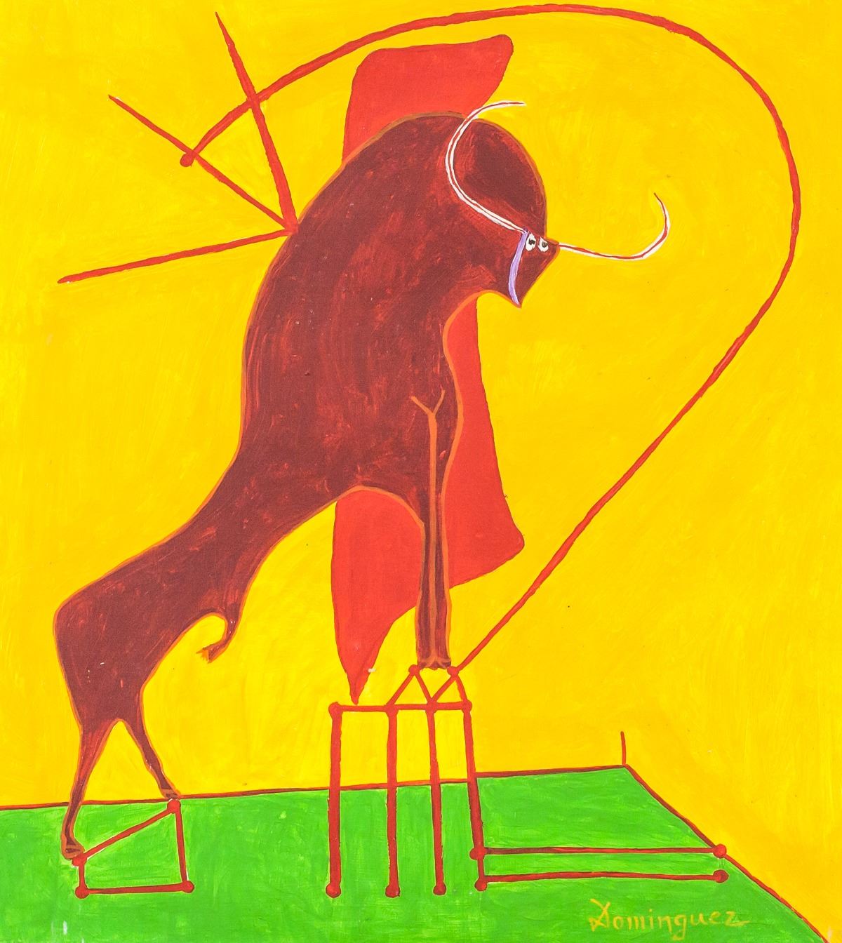 Oil on canvas. Featuring a bull in front of a red cape standing on thing stick structures. Signed "Dominguez" in the bottom right. 48 x 43 cm (18.75 x 17 in). Provenance: This lot carries limited provenance from a Southern Ontario estate