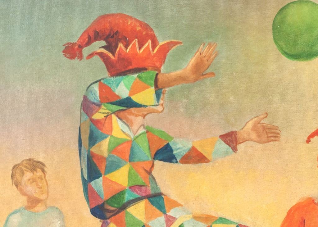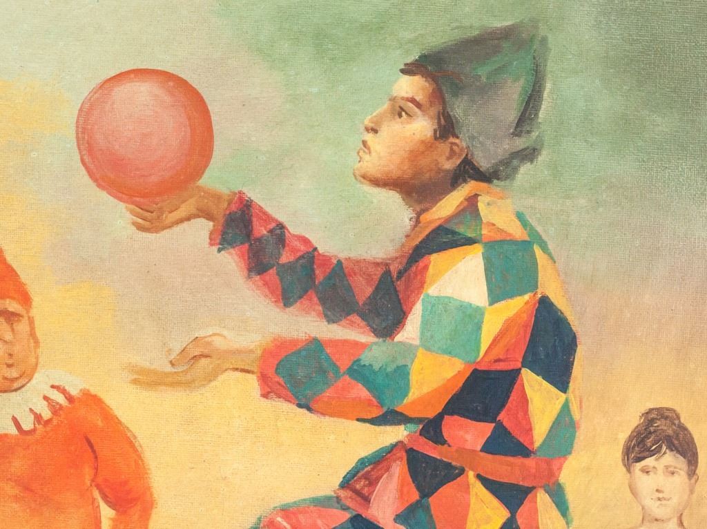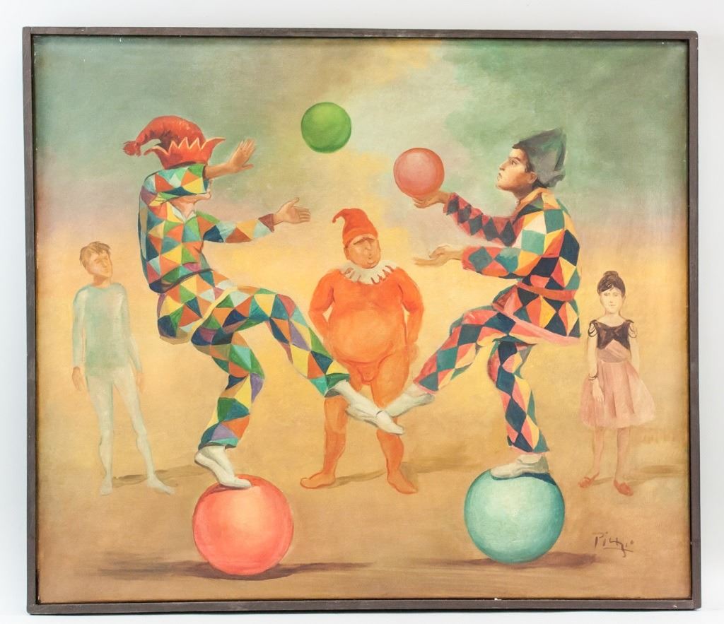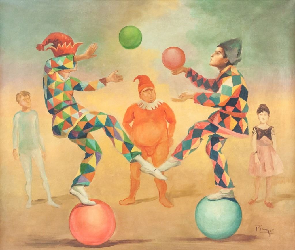 Oil on canvas, framed. Featuring two clowns juggling and balanced on balls. Signed "Picasso" to the bottom right. 59 x 69 cm (23 x 27 in), Frame: 62 x 72 cm (24 x 28 in).