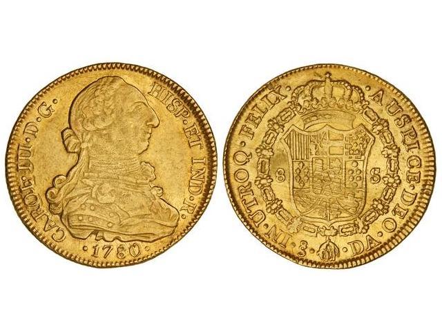 Spanish Monarchy: Charles Iii - 8 Escudos. 1780. SANTIAGO. D.A. Restos de brillo original. (Acuñación algo floja y rayas de ajuste en reverso. Golpecito en canto). ESCASA. Cal-234; XC-935. MBC+/EBC-.