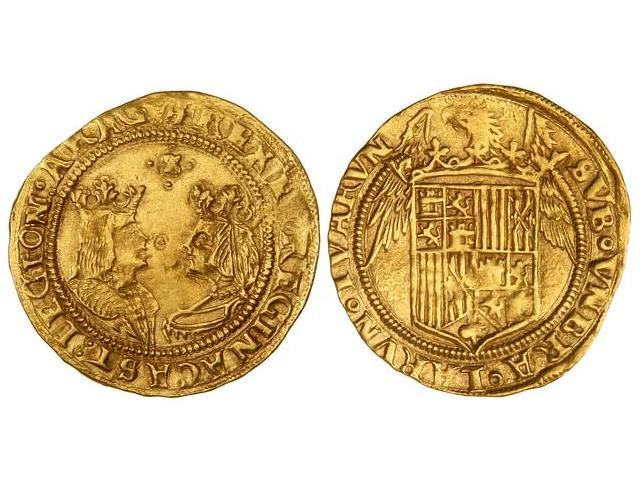 Spanish Monarchy: Ferdinand And Isabella - Doble Excelente. SEVILLA. Anv.: REX E(T) REGINA CAST:LEGION:ARAG:. Bustos afrontados, encima S acotada con cuatro puntos. Rev.: SVBVNBRALARVNTVARVN. Águila de San Juan sobre escudo coronado. AU. RARÍSIMA. Cal-85 sin marca de monedero y sin nombre de los reyes. EBC+.