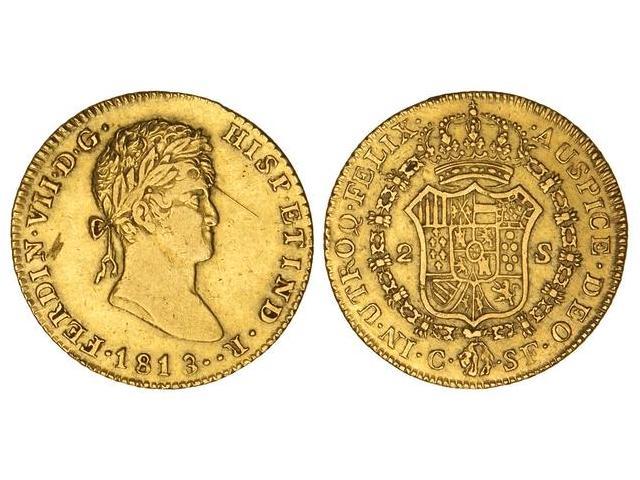 Spanish Monarchy: Ferdinand Vii - 2 Escudos. 1813. CATALUNYA. S.F. Acuñada en Palma de Mallorca. Sin punto entre S.F. (Rayitas en anverso). Cal-188. MBC.