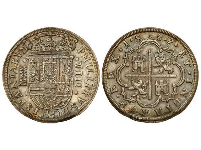 Spanish Monarchy: Philip Ii - 8 Reales. 1587. SEGOVIA. Anv.: PHILIPPUS.D.G.HISPANIARVM. Acueducto de siete arcos de dos pisos. Cruz entre fecha. Bonita pátina irisada. (Hojita en leyenda del reverso). BONITO EJEMPLAR. RARA. Cal-183. EBC.