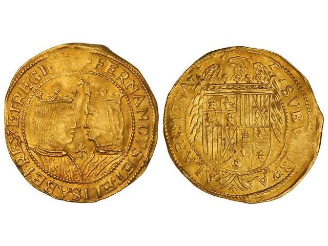 Spanish Monarchy: Philip Iii - Trentí. BARCELONA. Anv.: FERNANDVSETELISABETREXETREGIN(A). Bustos afrontados, entre ambos dos estrellas de 6 puntas. Rev.: SVB:VMBRA ALARVM:TVA. Escudo coronado bajo águila de San Juan. 7 grs. AU. MUY ESCASA. Cal-71. EBC.