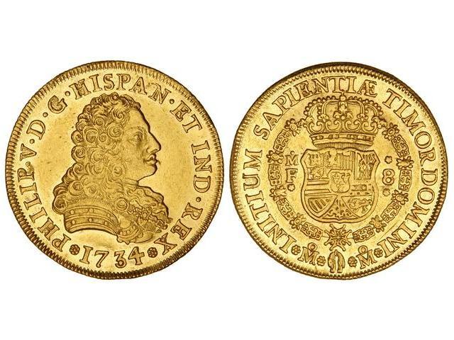 Spanish Monarchy: Philip V - 8 Escudos. 1734. MÉXICO. M.F. Rev.: Punto encima ensayador. Restos de brillo original. RARA. Cal-125; XC-425. EBC-.
