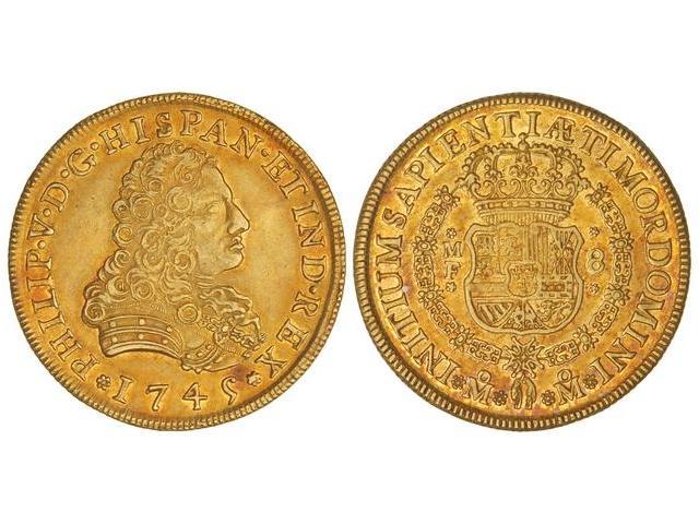Spanish Monarchy: Philip V - 8 Escudos. 1745. MÉXICO. M.F. Pátina y restos de brillo. RARA. Cal-141; XC-443. EBC-.