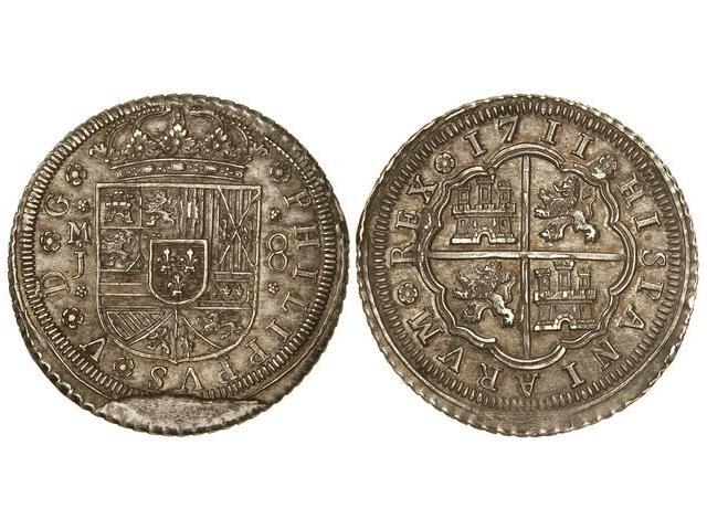 Spanish Monarchy: Philip V - 8 Reales. 1711. MADRID. J. V en PHILIPPVS e HISPANIARVM. Restos de brillo original. Bonita pátina. (Defecto de acuñación en anverso). MAGNÍFICO EJEMPLAR. RARA. Cal-680. EBC+.