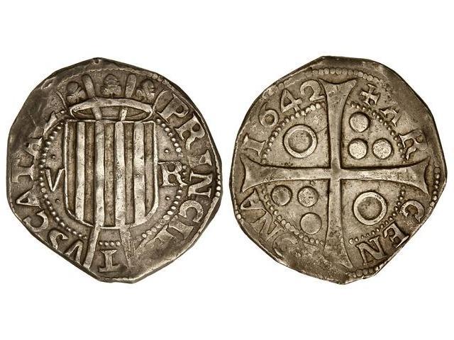 Spanish Monarchy: Reapers' War - 5 Rals. 1642. PRINCIPAT. ARGENTONA. Anv.: PRINCIP(A)-T-VS CATAL. Rev.: AR-GEN-TONA-1642. 11,96 grs. AR. RARA y MÁS EN ESTA CALIDAD. EL MEJOR EJEMPLAR CONOCIDO. Cal-31. EBC.