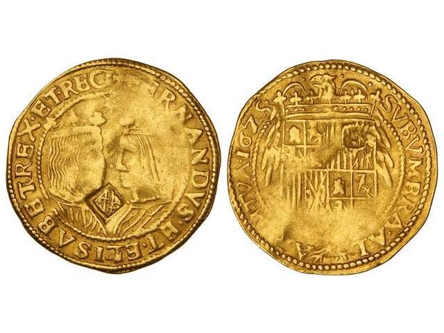 Spanish Monarchy: Reapers' War - Trentí. 1625. BARCELONA. Anv.: FERNANDVS.ET.ELISABET.REX.ET.REG. Bustos afrontados de los Reyes Católicos, encima estrella de seis puntas, entre ambos resello escudito de Barcelona. Rev.: SVB VMBRA.AL-AR(V)M.TVA.16Z5. 7 grs. AU. MUY RARA. Cal-2. (MBC+).