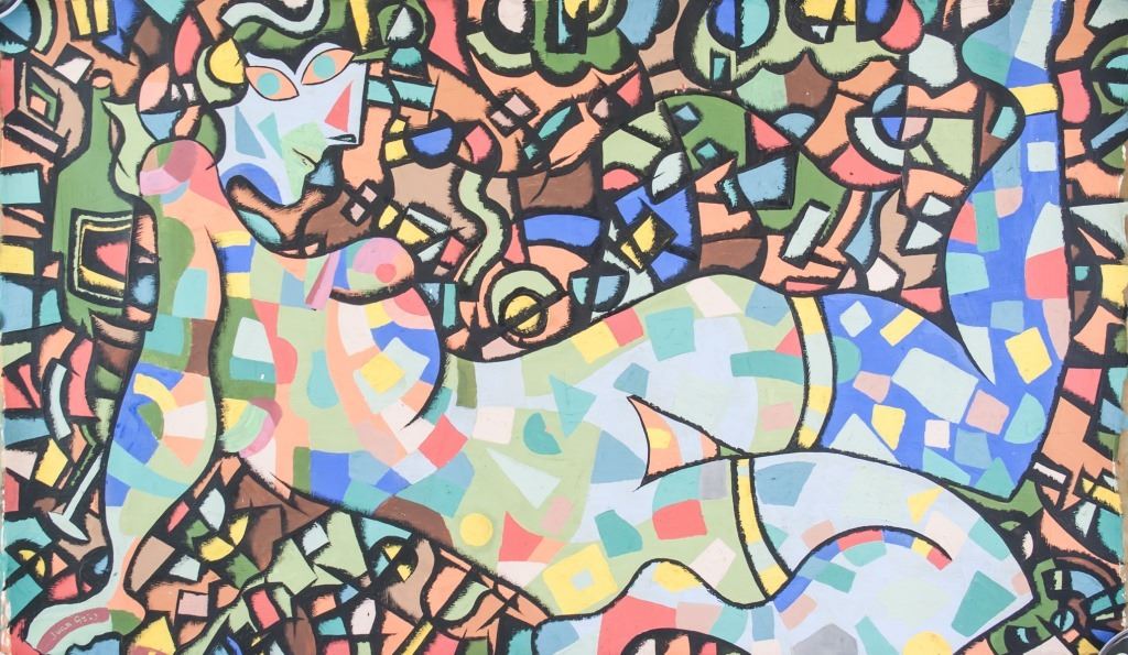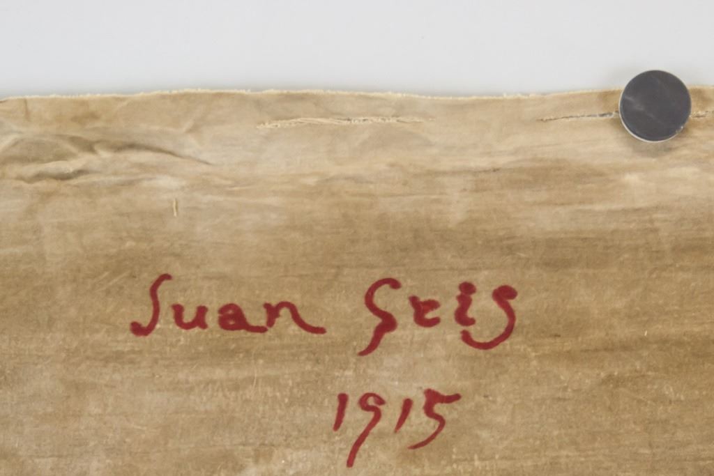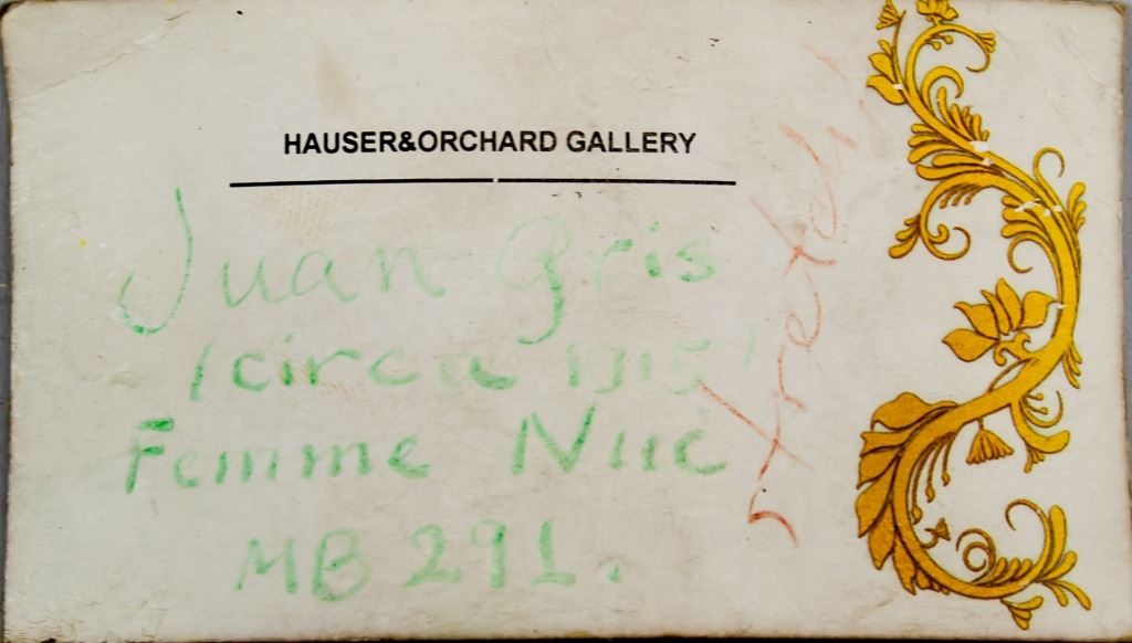 Oil on canvas. Featuring abstract female nude. Signed "Juan Gris" to the bottom left. "Juan Gris 1915" inscribed on verso. Label on verso reads "Hauser&Orchard Gallery / Juan Gris / Circa 1915 / Femme Niic ME 291". 65 x 106 cm (25.5 x 42 inches).
