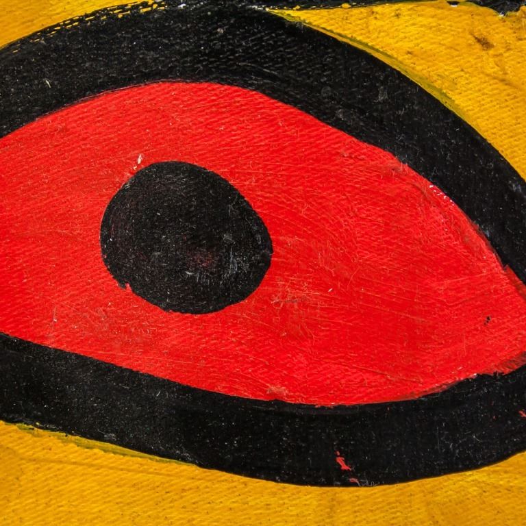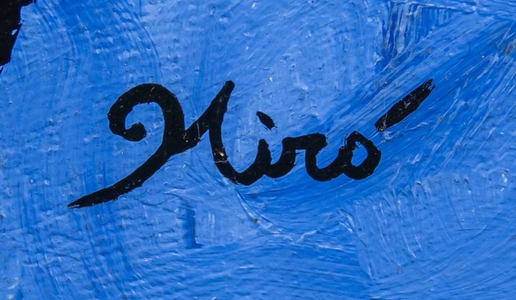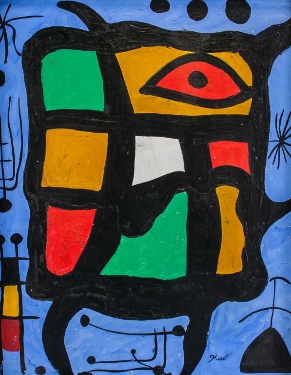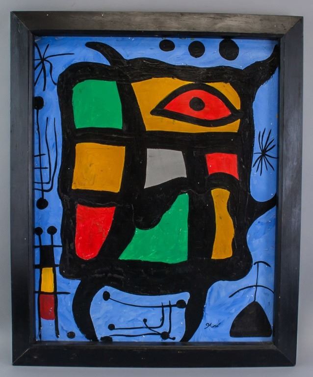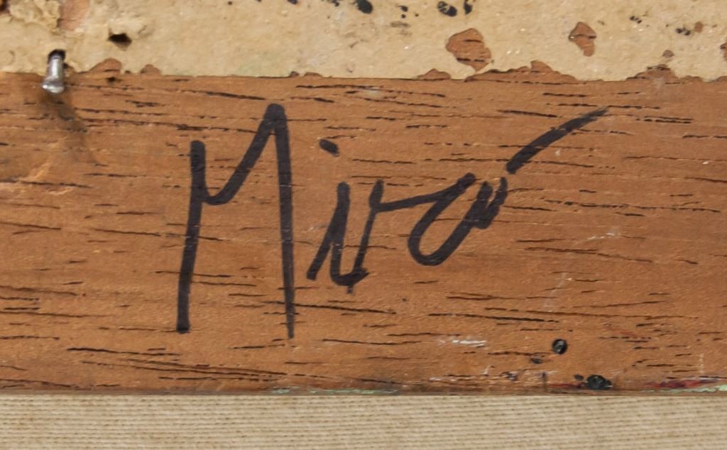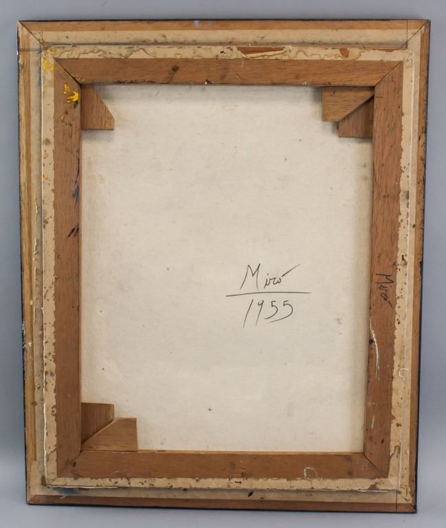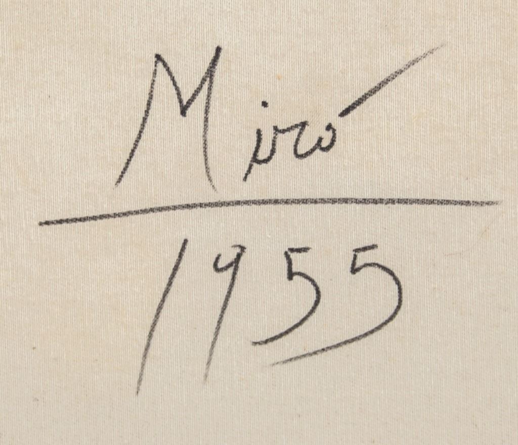Oil on canvas, framed. Featuring surrealist composition. Signed "Miro" to the bottom right. "Miro 1955" inscribed on verso. Canvas size: 47 x 60 cm (18.5 x 24 inches). Frame size: 57 x 67 cm (22.5 x 26.5 inches).