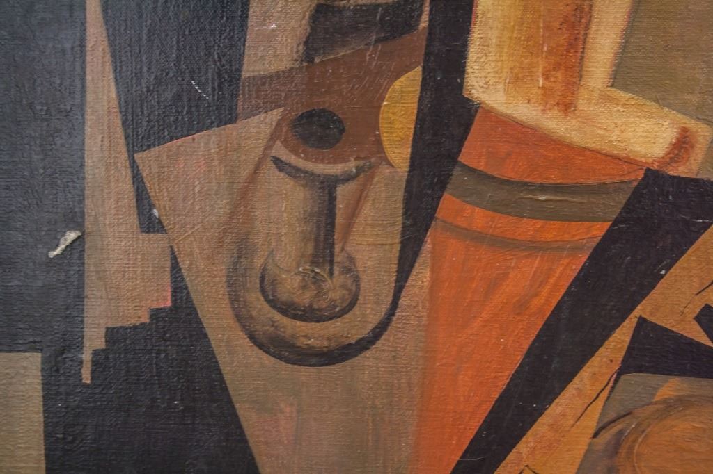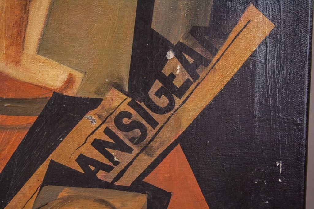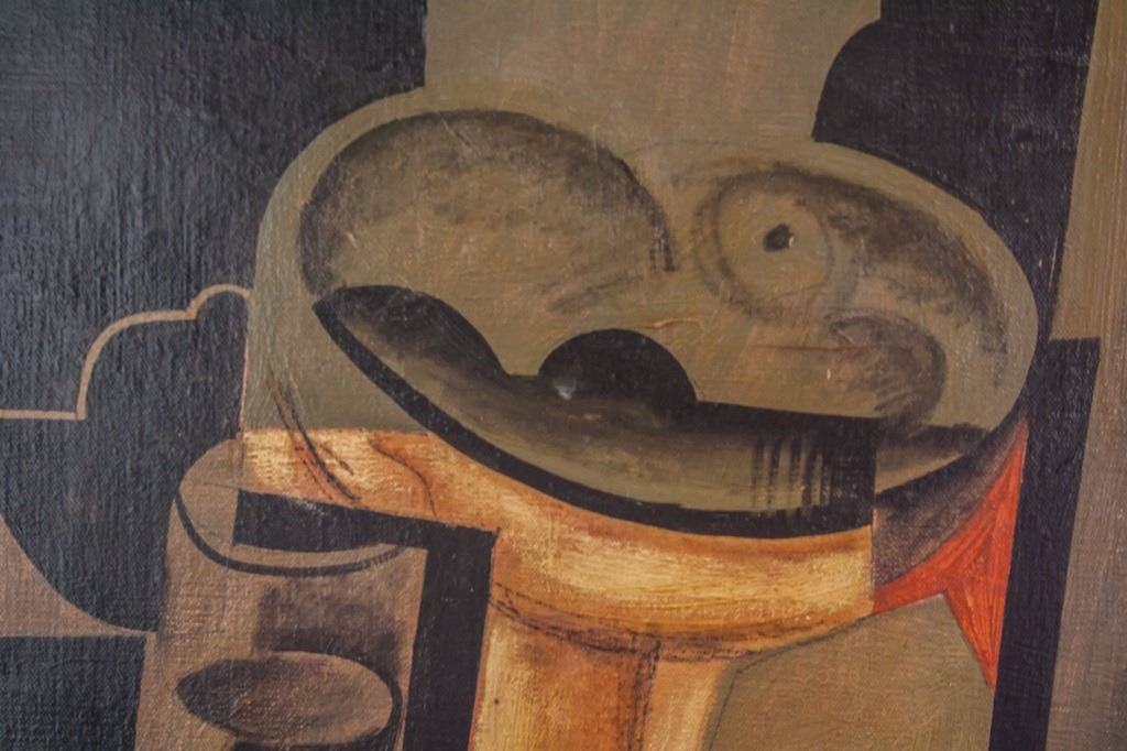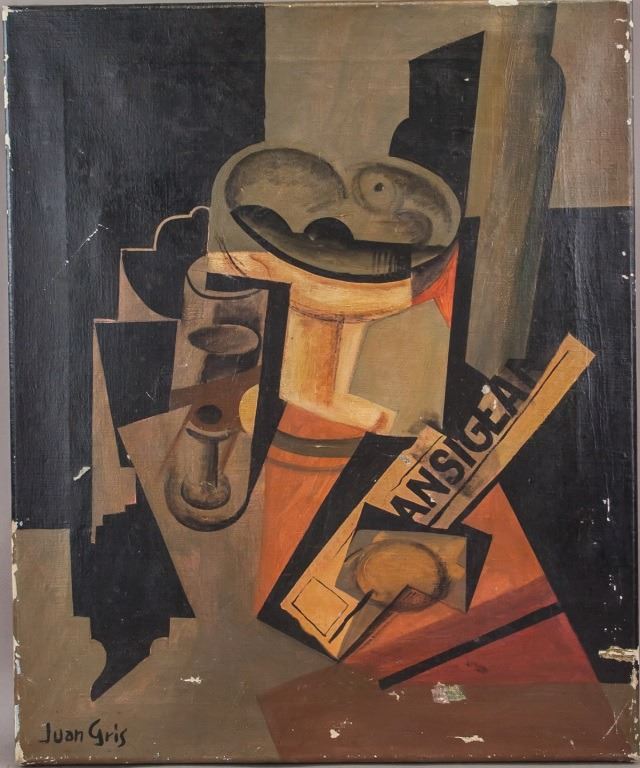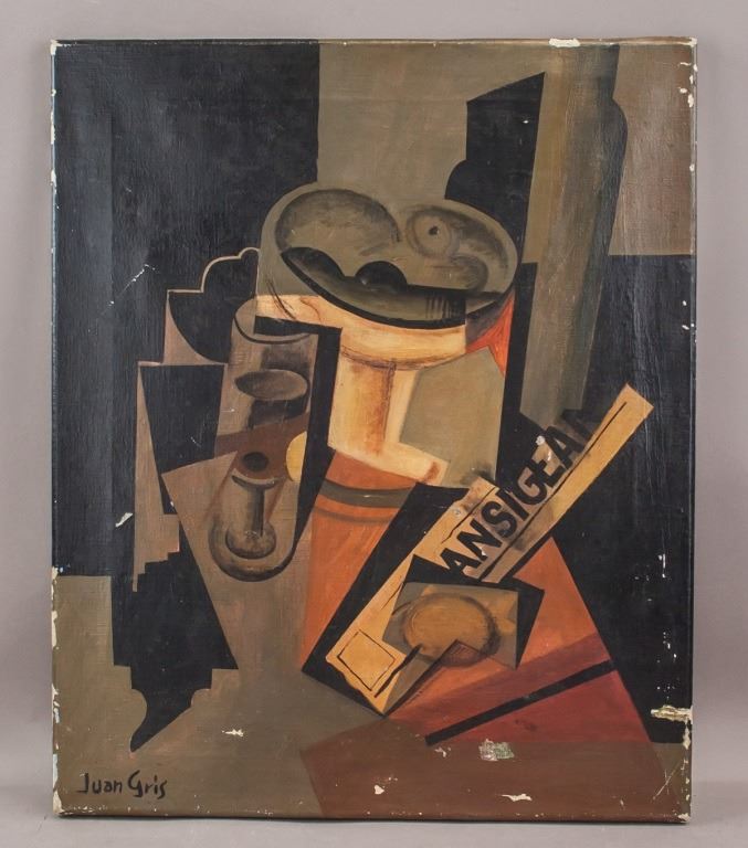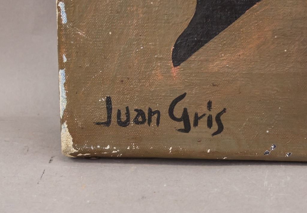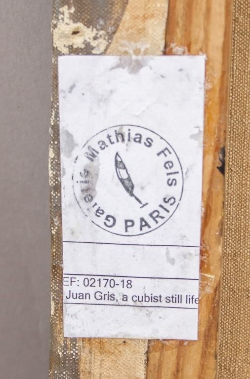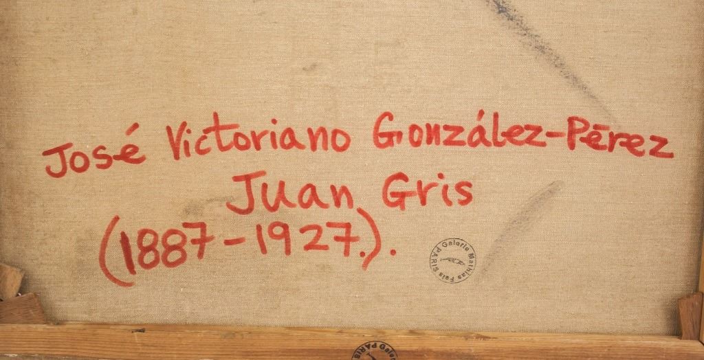 Oil on canvas. Featuring cubist still-life composition. Signed "Juan Gris" to the bottom left corner. "Jose Victoriano Gonzalez-Perez Juan Gris (1887-1927)" inscribed on verso. "Galeria Mathias Fels PARIS" stamped on verso. 42 x 51 cm (16 1/2 x 20 inches).