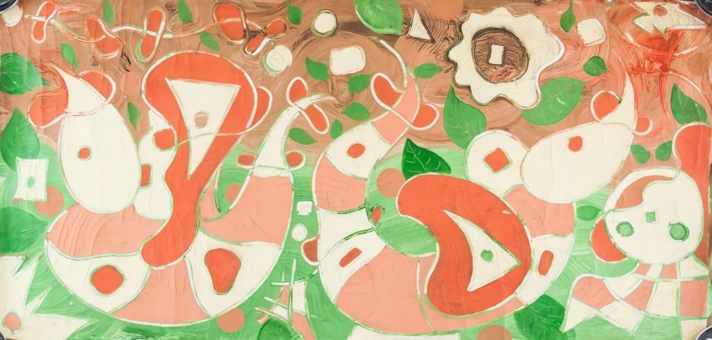 Oil on canvas. Featuring abstract composition. Signed Miro to the bottom right corner. Stamp on verso reads "TO Louis Berger PARIS". 65 x 123 cm (25.5 x 48.5 in).