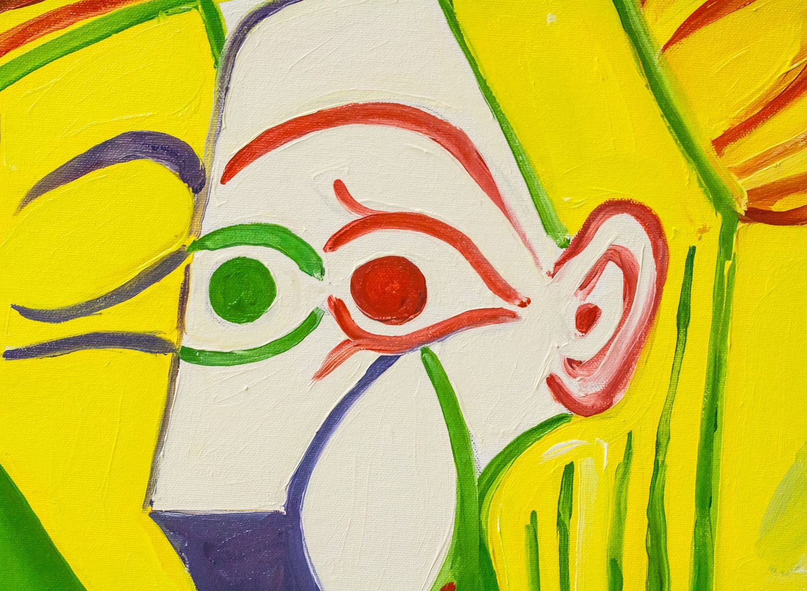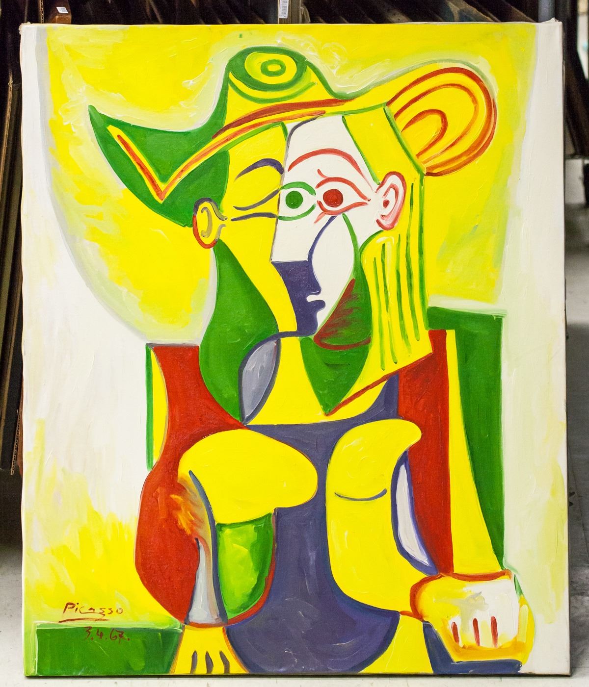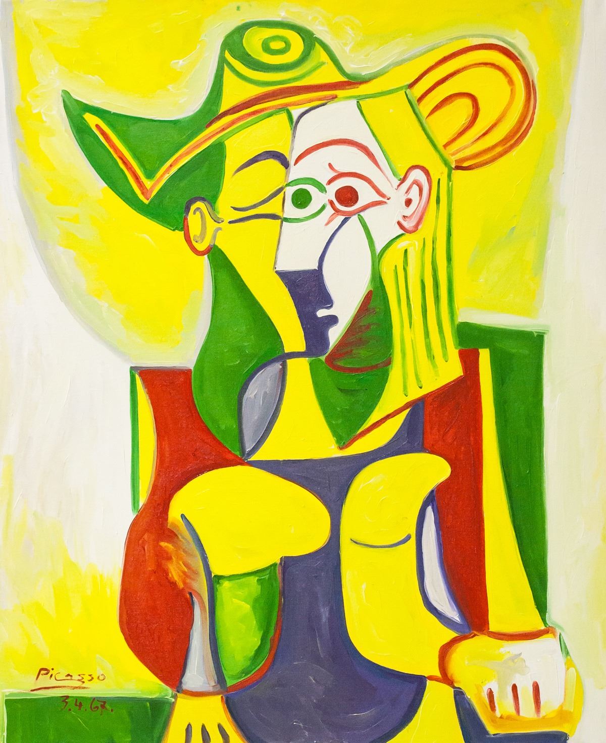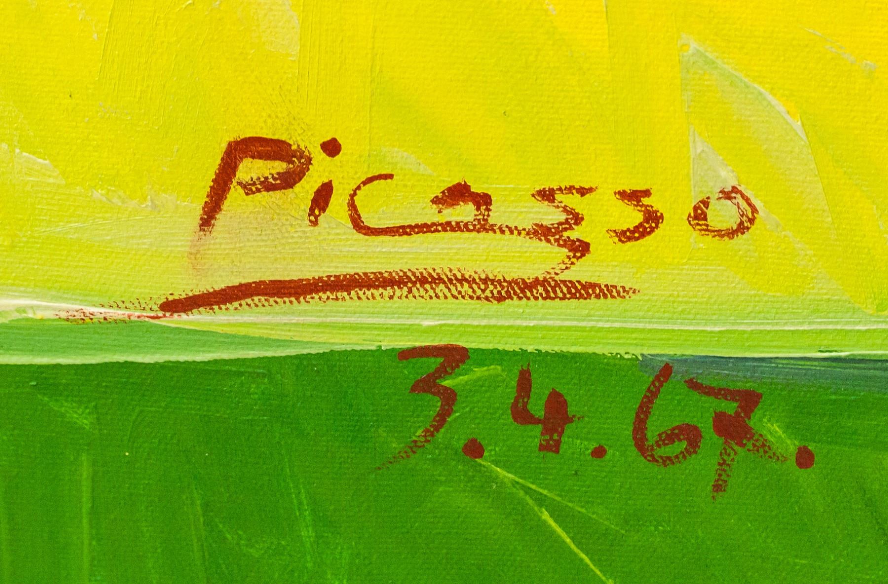 OIl on canvas. Featuring cubist portrait. Signed "Picasso" in the bottom left corner with "3.4.67" inscribed beneath the signature. 92 x 76 cm (36 x 30 in). This lot carries limited provenance from a Toronto collection