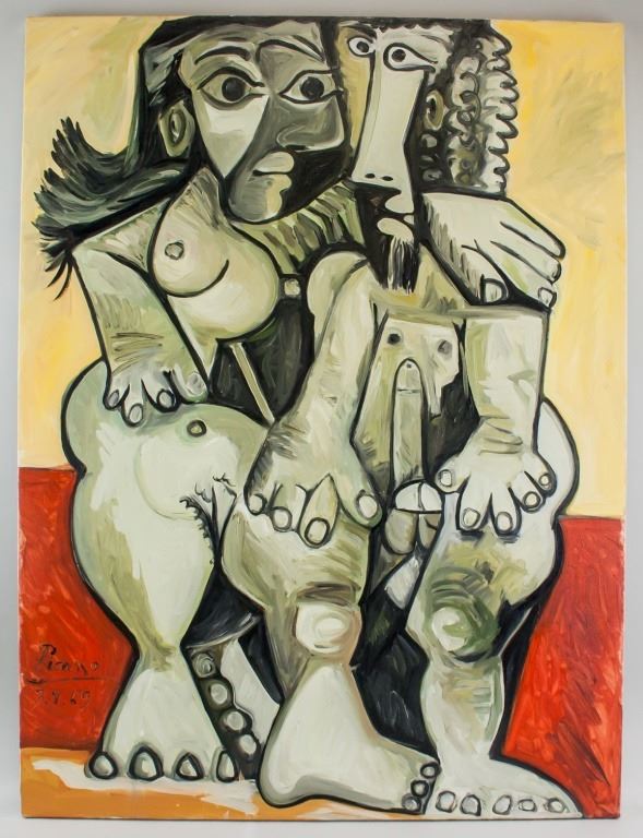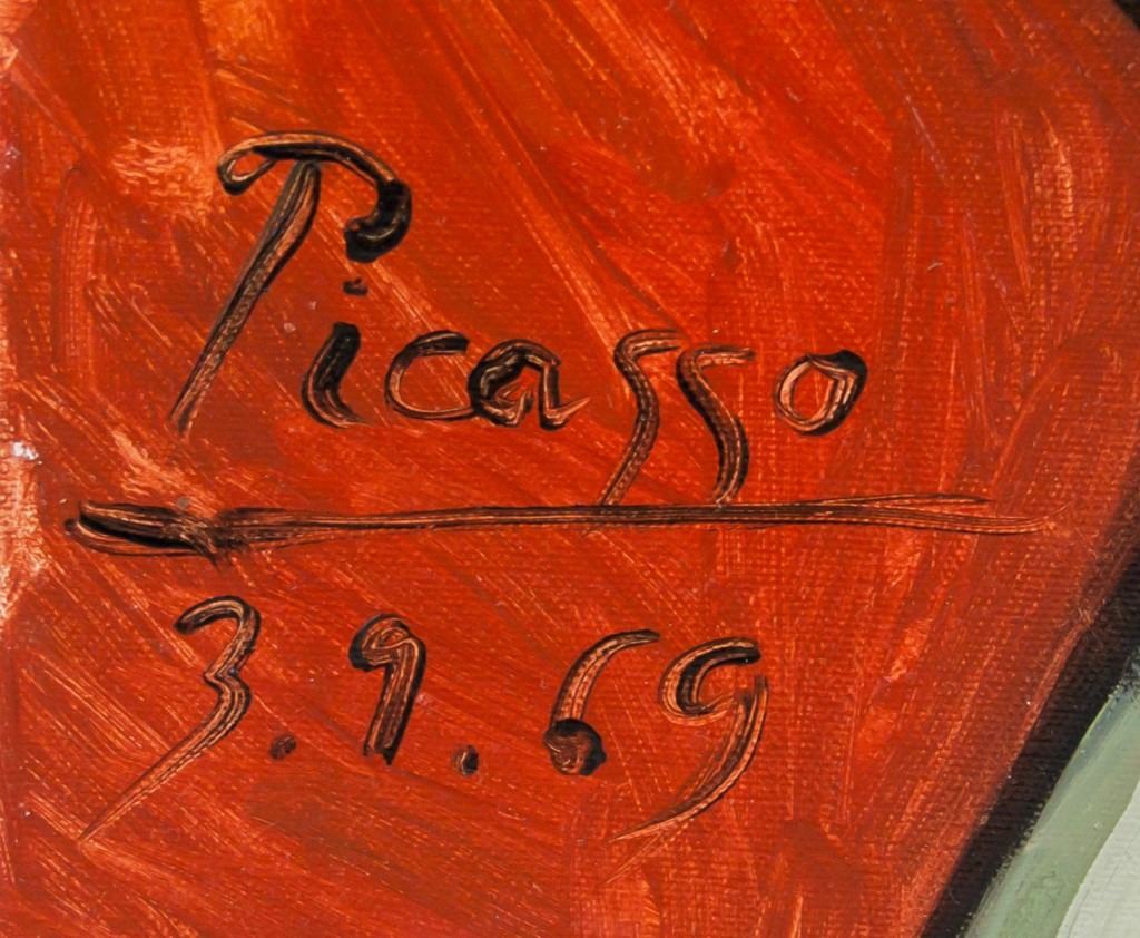 Oil on canvas. Featuring a cubist portrait. Signed Picasso and inscribed 3.9.69 underneath the signature. Label affixed to stretcher bar near upper left corner, verso. Label inscribed "Picasso-Follower / '3.9.69' / 40" X 30" (101.6cm X 76.2cm) / Oil On Canvas / Estimate: 8,000-12,000". Inscribed in ink 3.9.69, verso. Canvas size: 102 x 76 cm (40 x 30 inches)