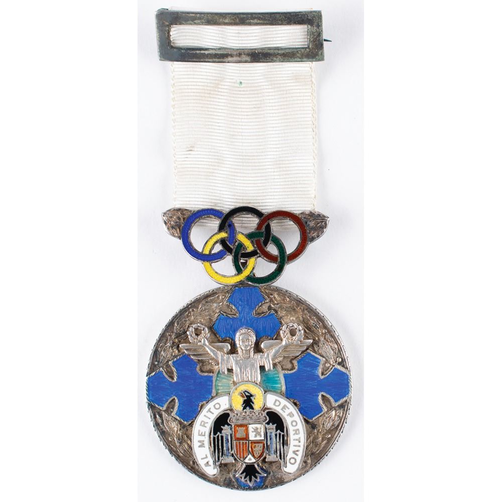 Scarce Spanish Olympic Committee Medal from 1950. Silver, 44 gm, 44 mm. The front features an enameled blue four-armed cross flanked by two etched laurel branches, superimposed by a silver Olympic Spanish female figure over a period Spanish coat of arms with white inscribed band, “AL MERITO DEPORTIVO [For Sport Merit].†The reverse is plain. The medal is suspended from a white ribbon, 51 mm in length, with lower enameled emblem of the International Olympic Committee.